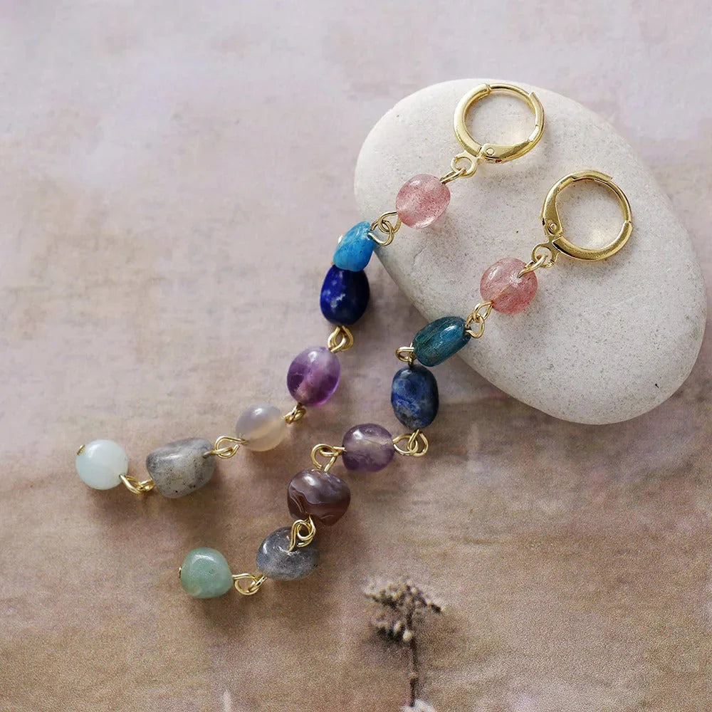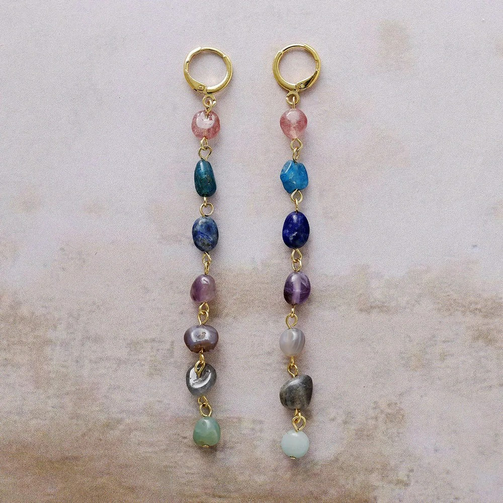 Elevate your style with the Bohemian Aura Drop Earrings, a vibrant cascade of natural stones that channel free-spirited energy and timeless charm. Handcrafted with golden accents, these earrings bring a touch of effortless elegance and positive vibes to any look.