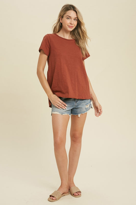 Crafted from lightweight, breathable fabric with a lived-in feel, this top is perfect for warm days and easy layering. The warm brick tone pairs beautifully with denim, linen, or tailored bottoms for a casual yet intentional look.