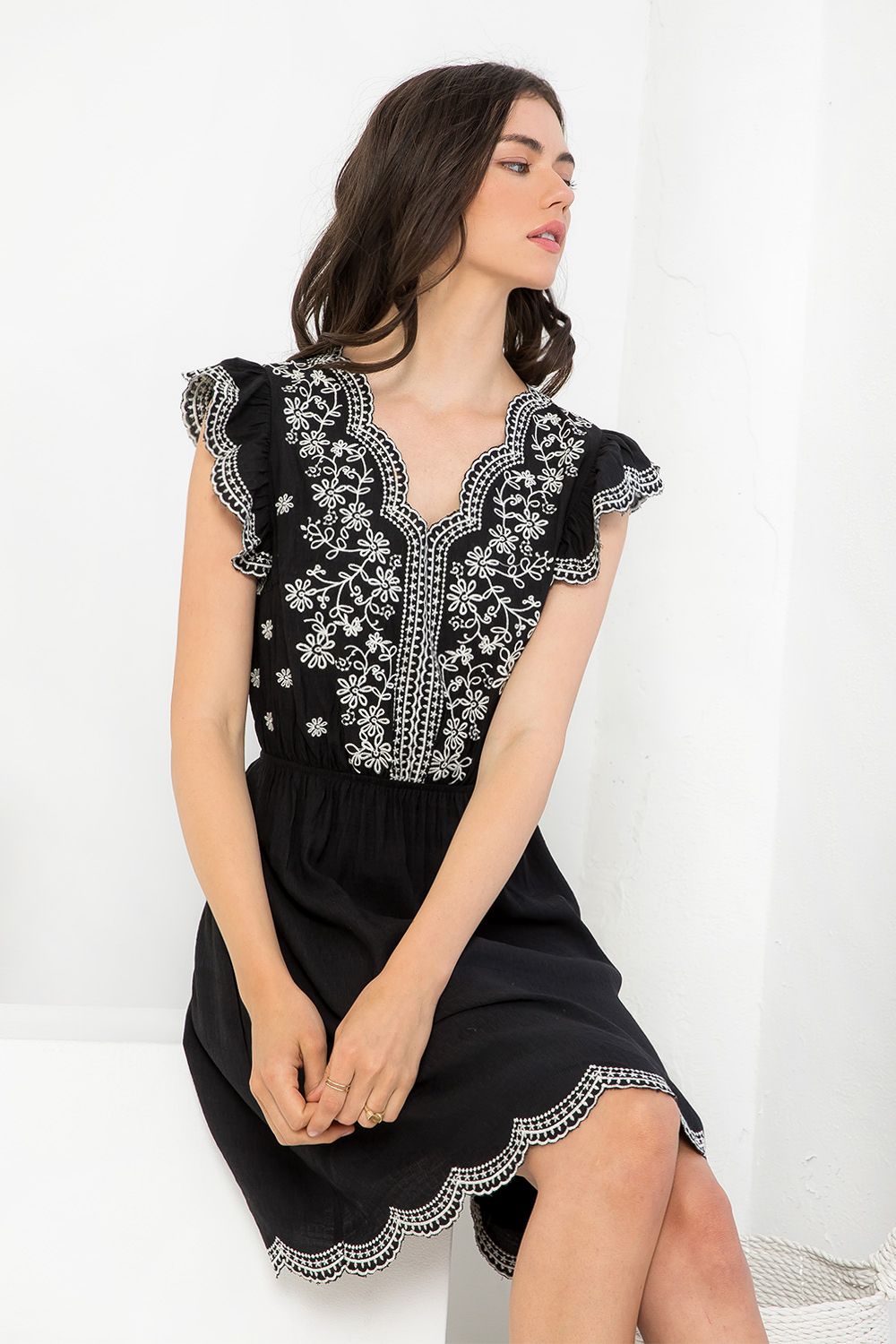 Indulge in elevated simplicity with our Black Embroidered Flutter Sleeve Dress—a sophisticated take on bohemian style. Crafted from airy, breathable fabric, this dress features exquisite ivory embroidery that graces the bodice and scalloped neckline with artisanal precision.