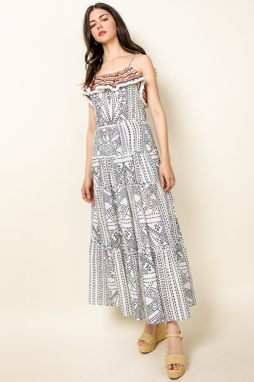 Turn heads in the effortlessly boho-chic Solara Maxi Dress. Designed with adjustable spaghetti straps, a soft ruffle neckline, and a breezy tiered skirt, this flowy favorite is your go-to for warm-weather style. The bold tribal print at the top adds a vibrant pop of color that makes this maxi truly unique.