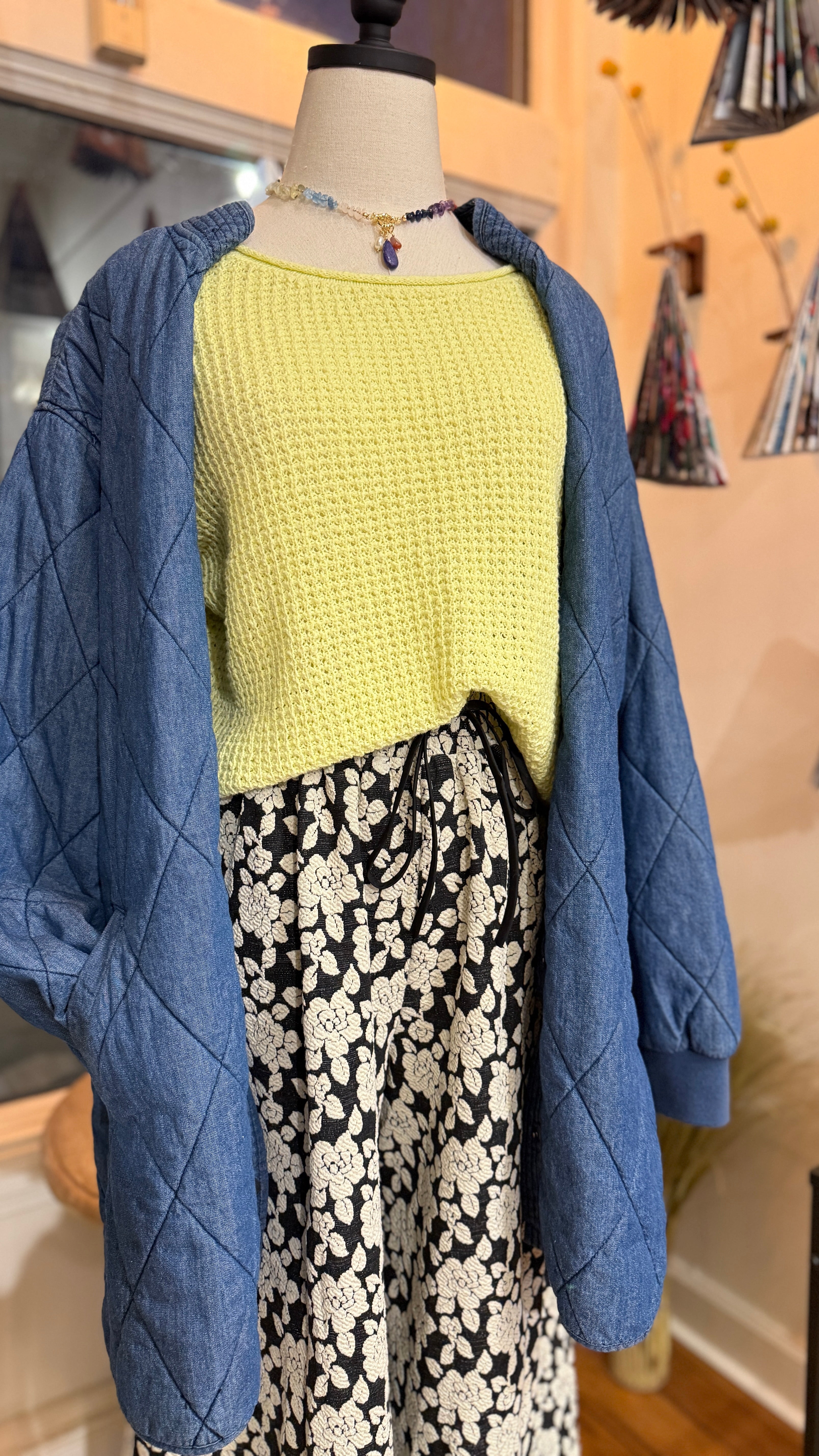 The quilted texture adds dimension while elastic sleeves and side pockets balance form with function. Designed in a one-size fit, it layers effortlessly over tees, knits, or dresses, making it a versatile piece you’ll reach for season after season.