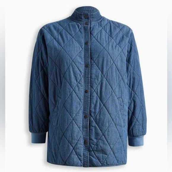 This quilted chambray jacket is a standout layering piece designed with an intentional oversized silhouette and sculptural shape. Crafted from a soft denim chambray with a subtle sheen, it brings an elevated finish to an everyday essential.