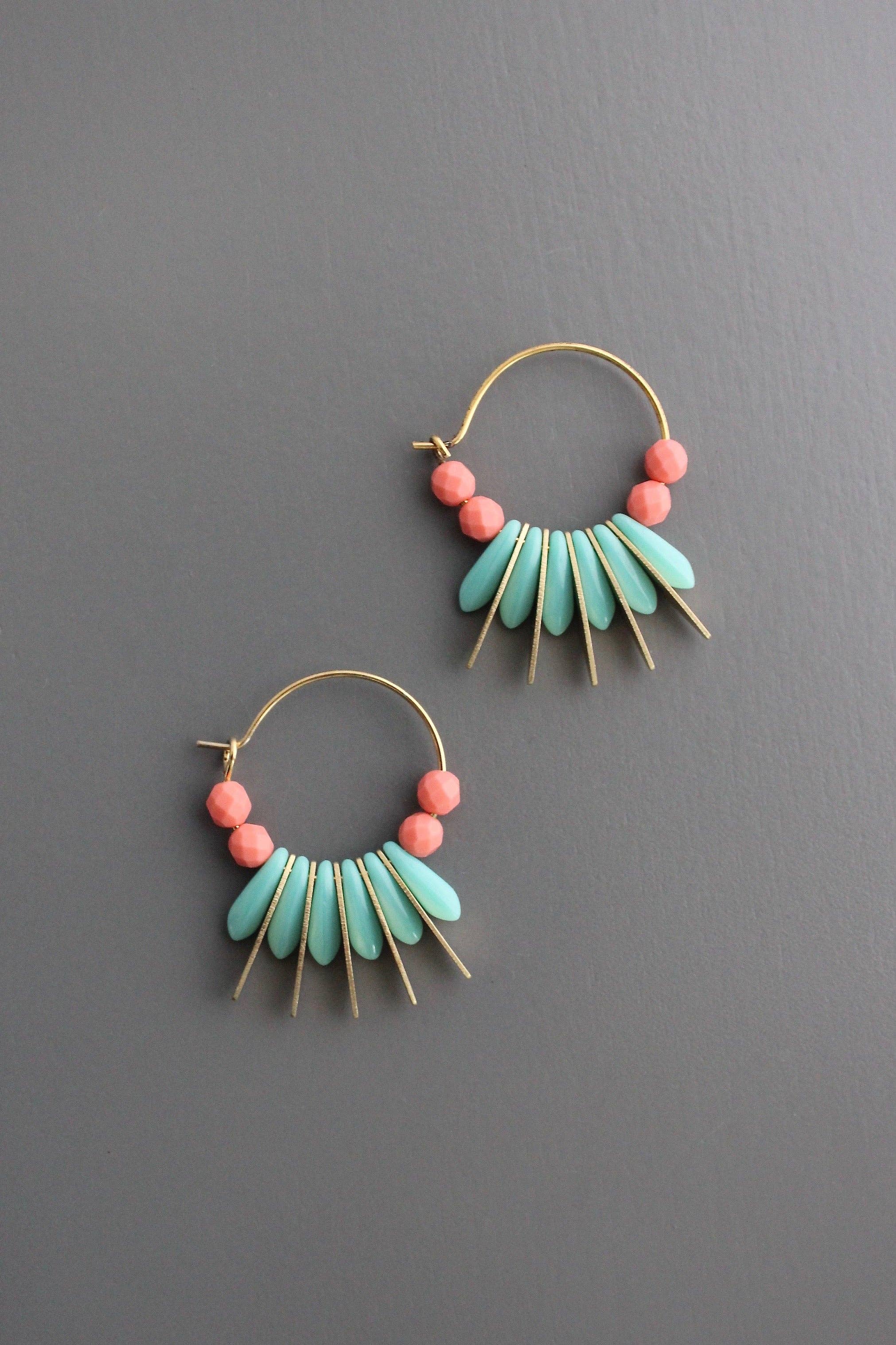 18k gold plated brass hoop earrings with glass and brass. Each pair weighs .15 oz. and measures 1 3/8 inches long.