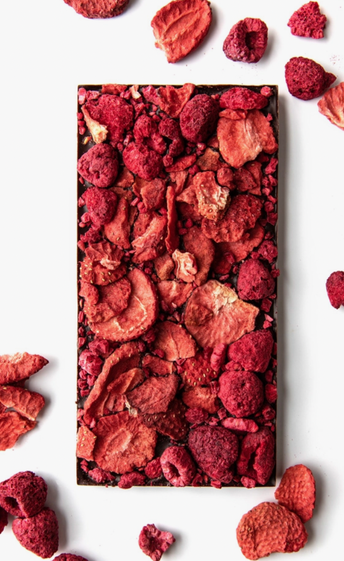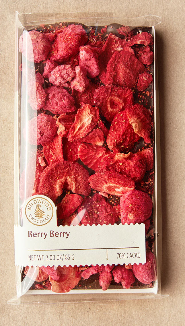 Even more striking than the beauty of this bar is the balance of its tart and natural sweetness brought forward by hand-placed strawberries and raspberries on top of rich 70% dark chocolate. Enjoy on its own or with a bowl of vanilla ice cream.