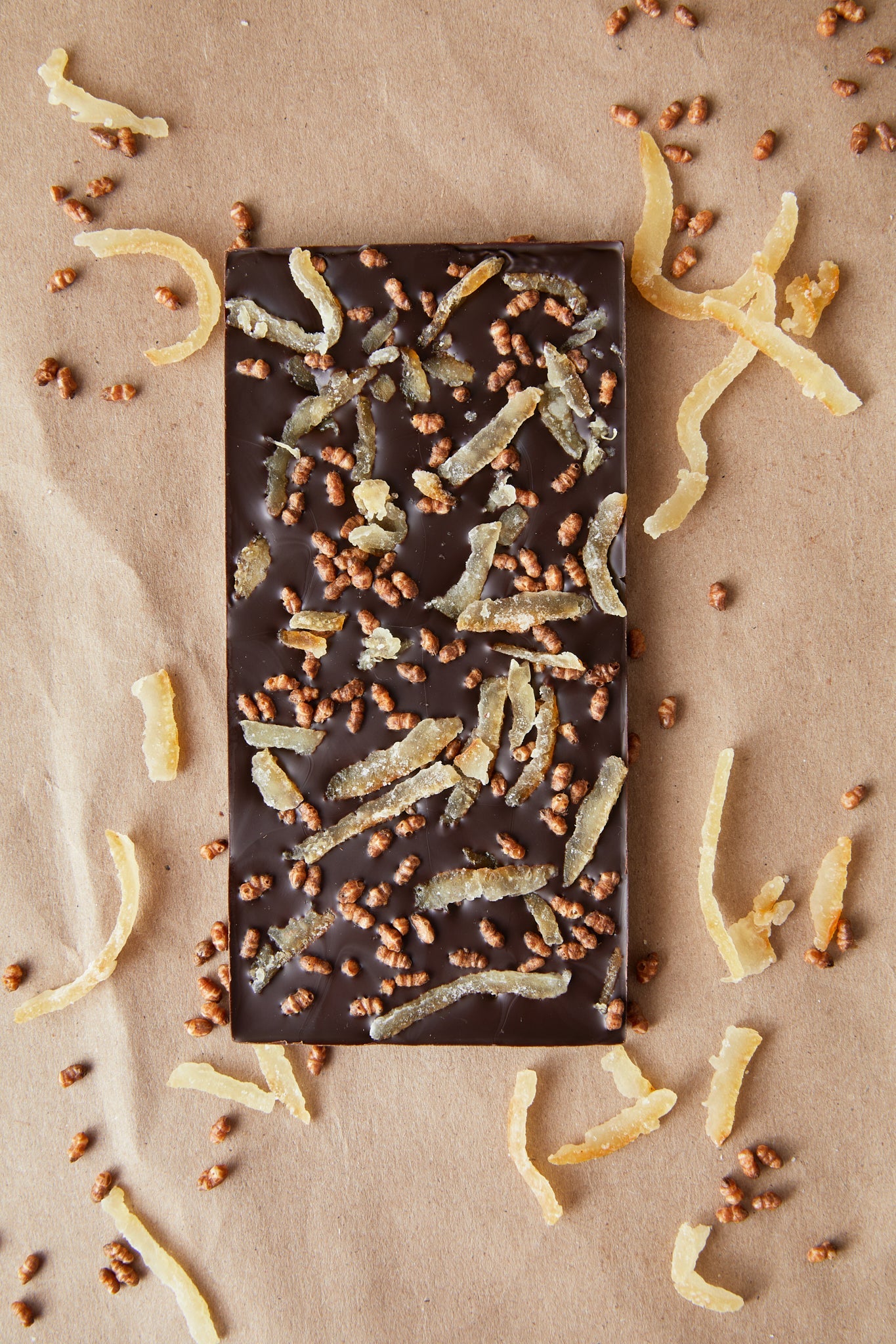 Delicate floral candied yuzu pairs beautifully with subtle nutty crunchy roasted brown rice, blending beautiful flavors and textures over rich 70% dark chocolate. Enjoy with a cup of genmaicha or your favorite cheese.