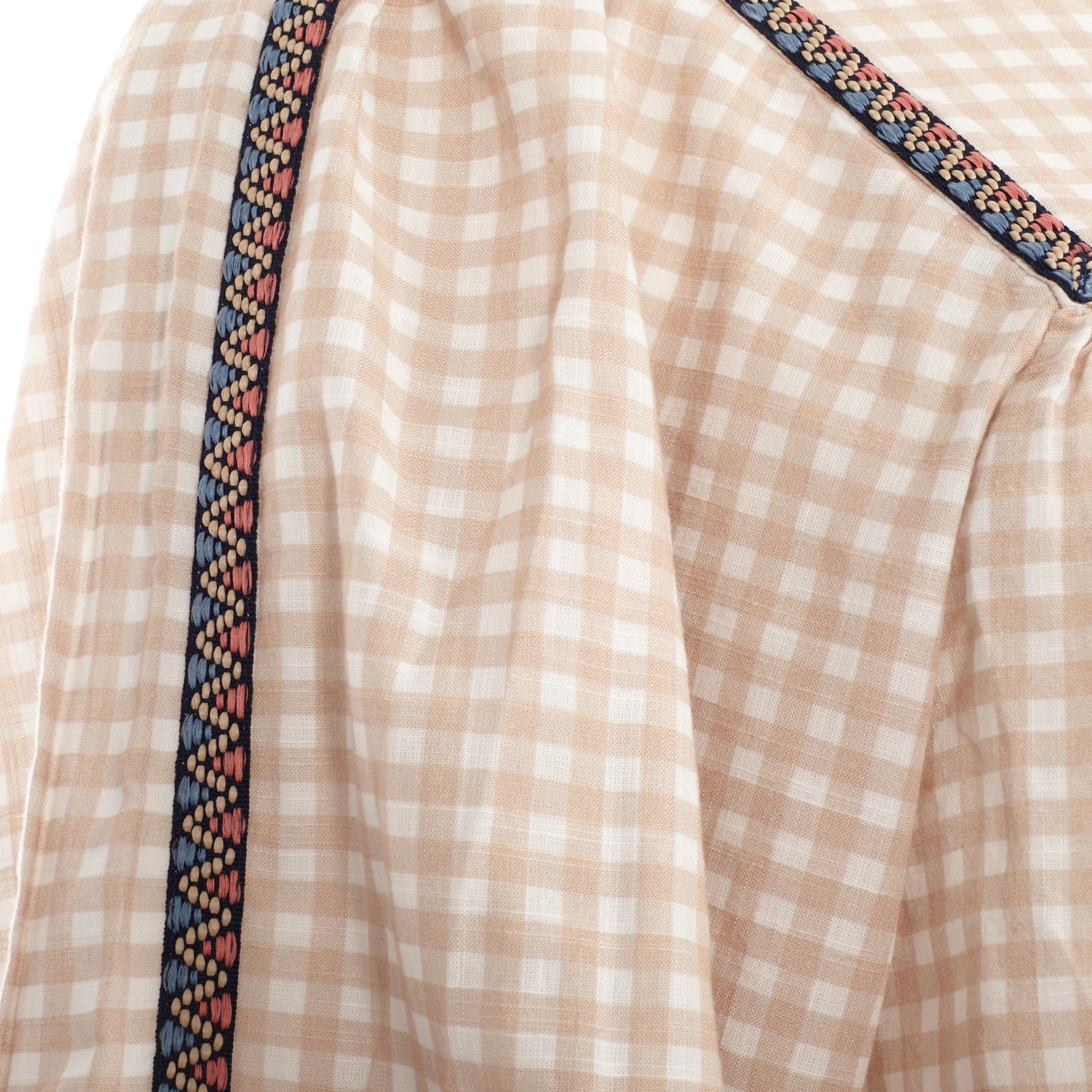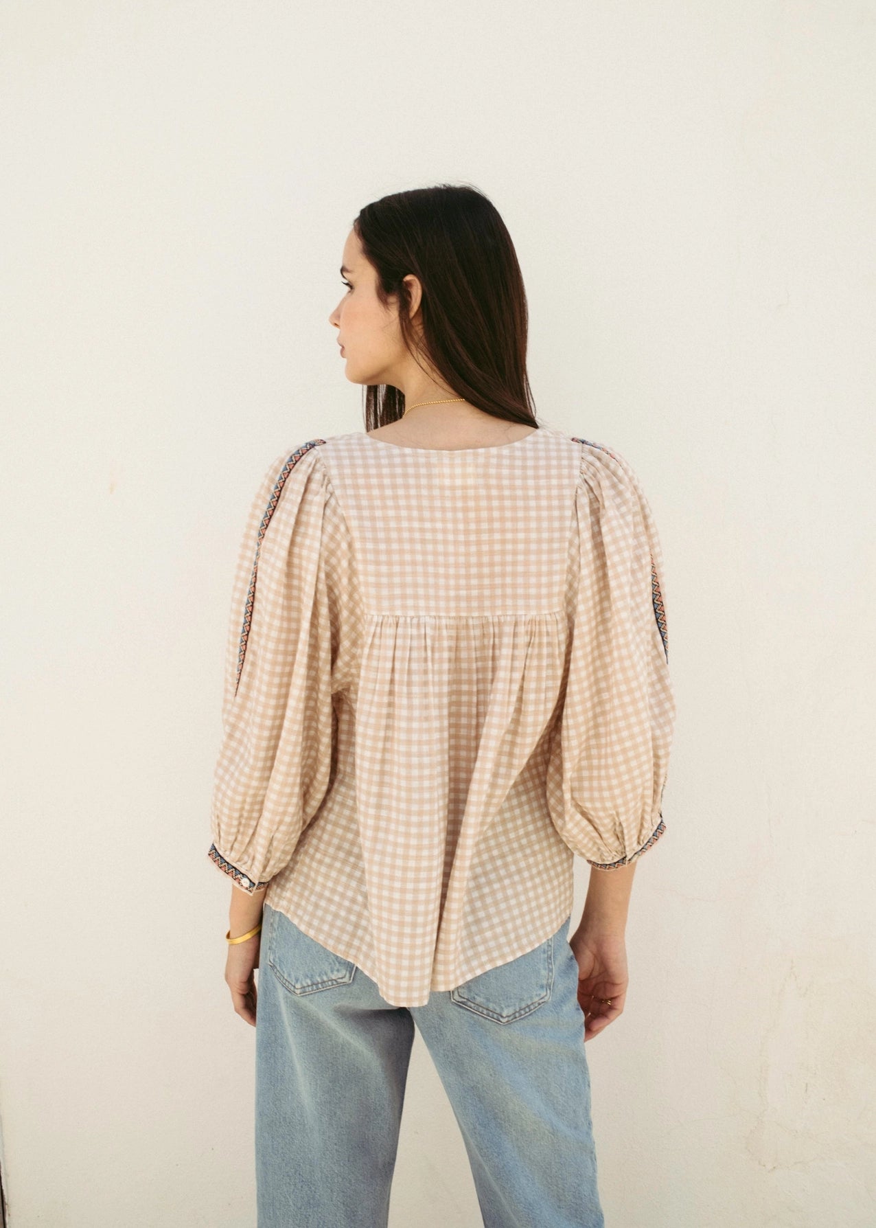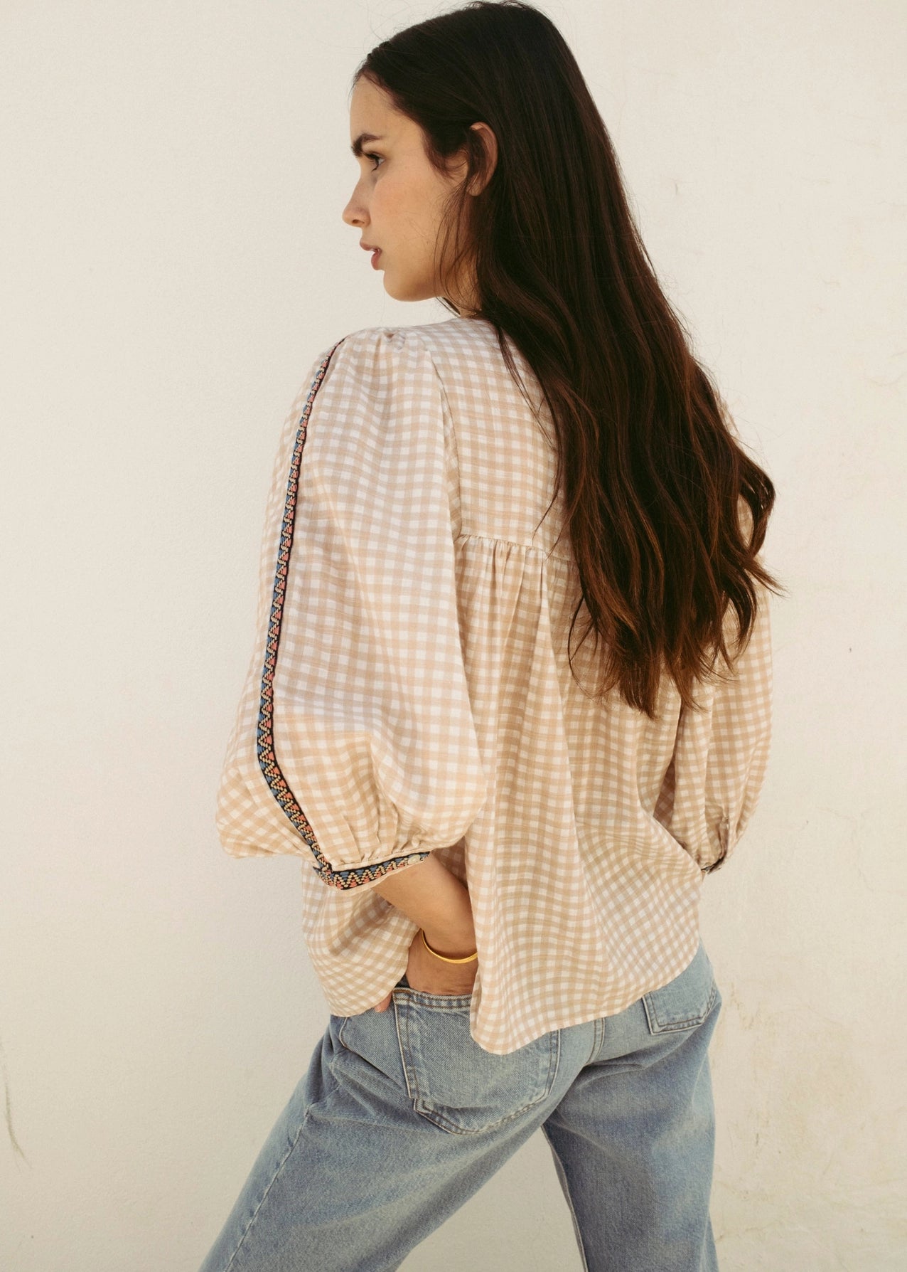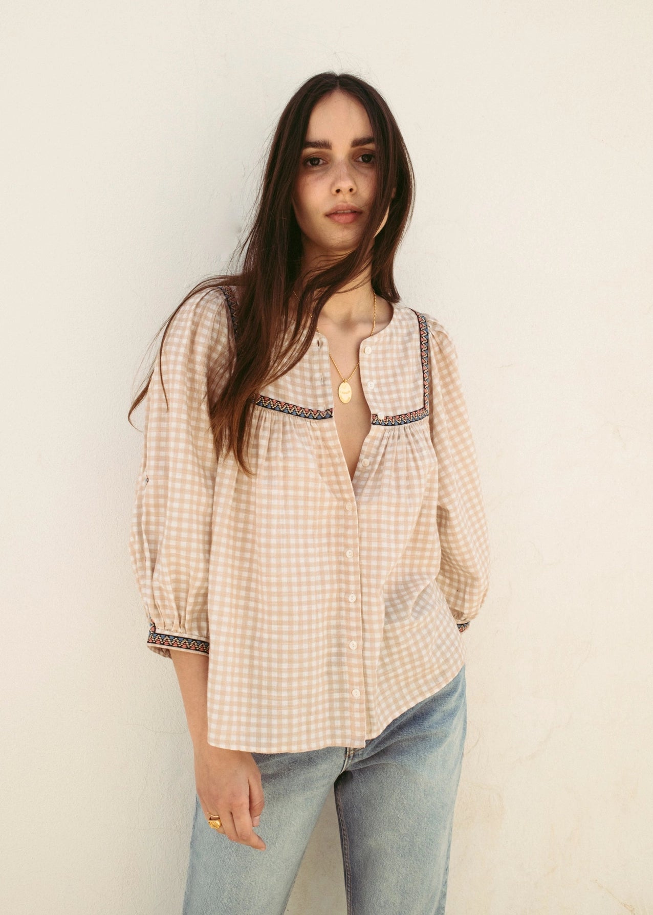 Our Bianca Blouse is one of our most casual blouses and invites you to a perfect bohemian look for an every day outfit. Slightly flared, buttoned from top to bottom and the wide sleeves make this top perfect for any occasion. It is made of a fluid viscose cotton blend, perfect for this season in beige Vichy checks with embroidered strips. Wear this loose, tucked in, or tied in the front for a cute look!