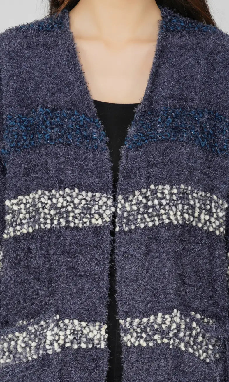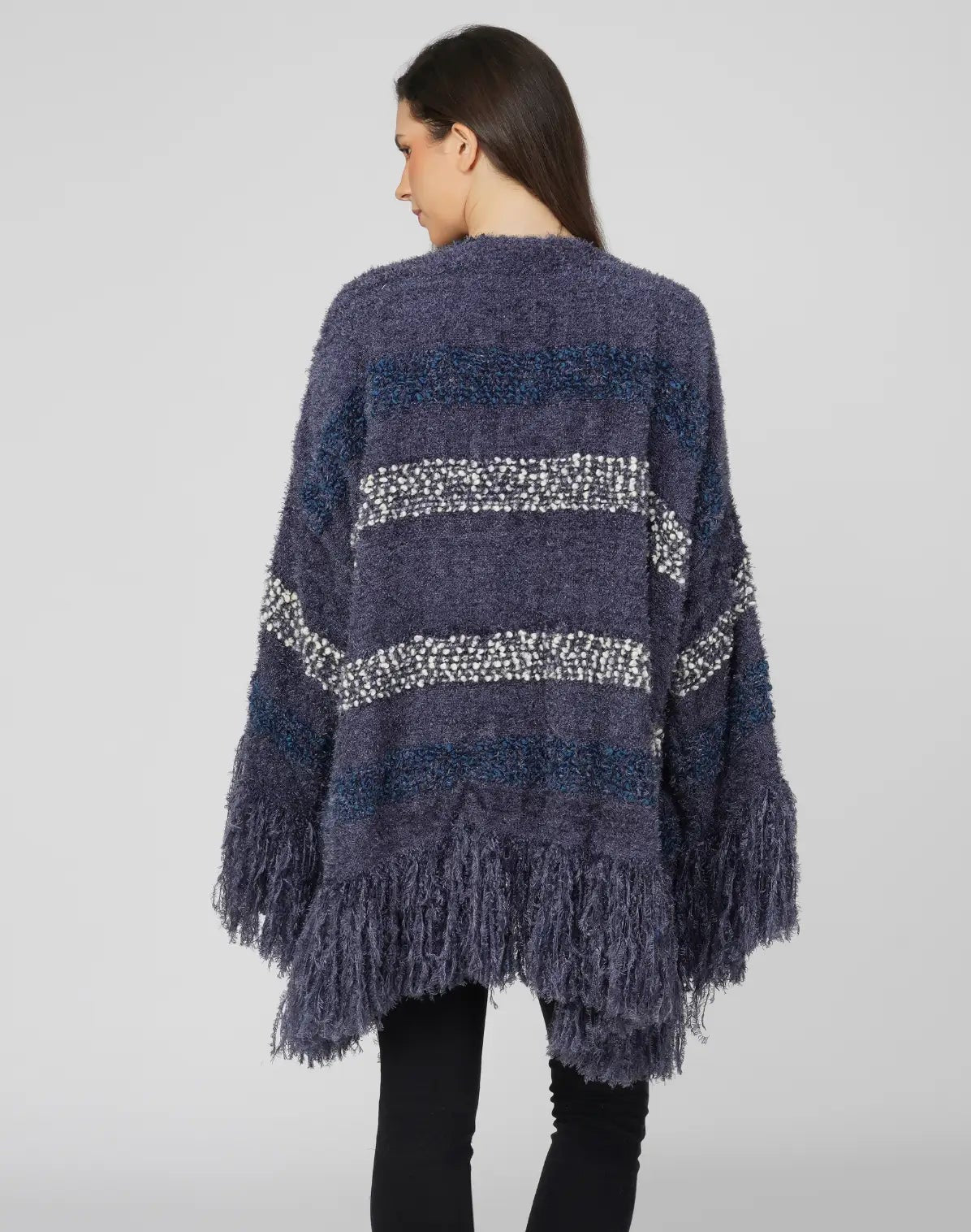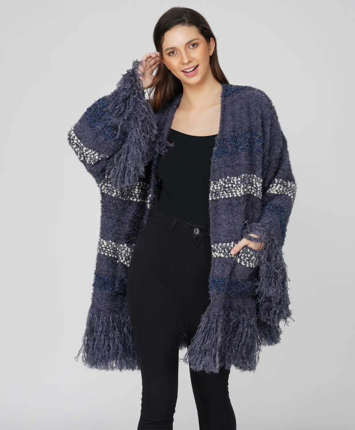 This cozy kimono sleeve cardigan in blueish grey is a great layering piece. The cardigan features white stripes in fancy yarns at the bottom and sleeve hem with a kimono style cut and fringed edges. Wear it open or cinch your waist with a waist belt. Pair this piece with a white/black tee, black jeans and booties!