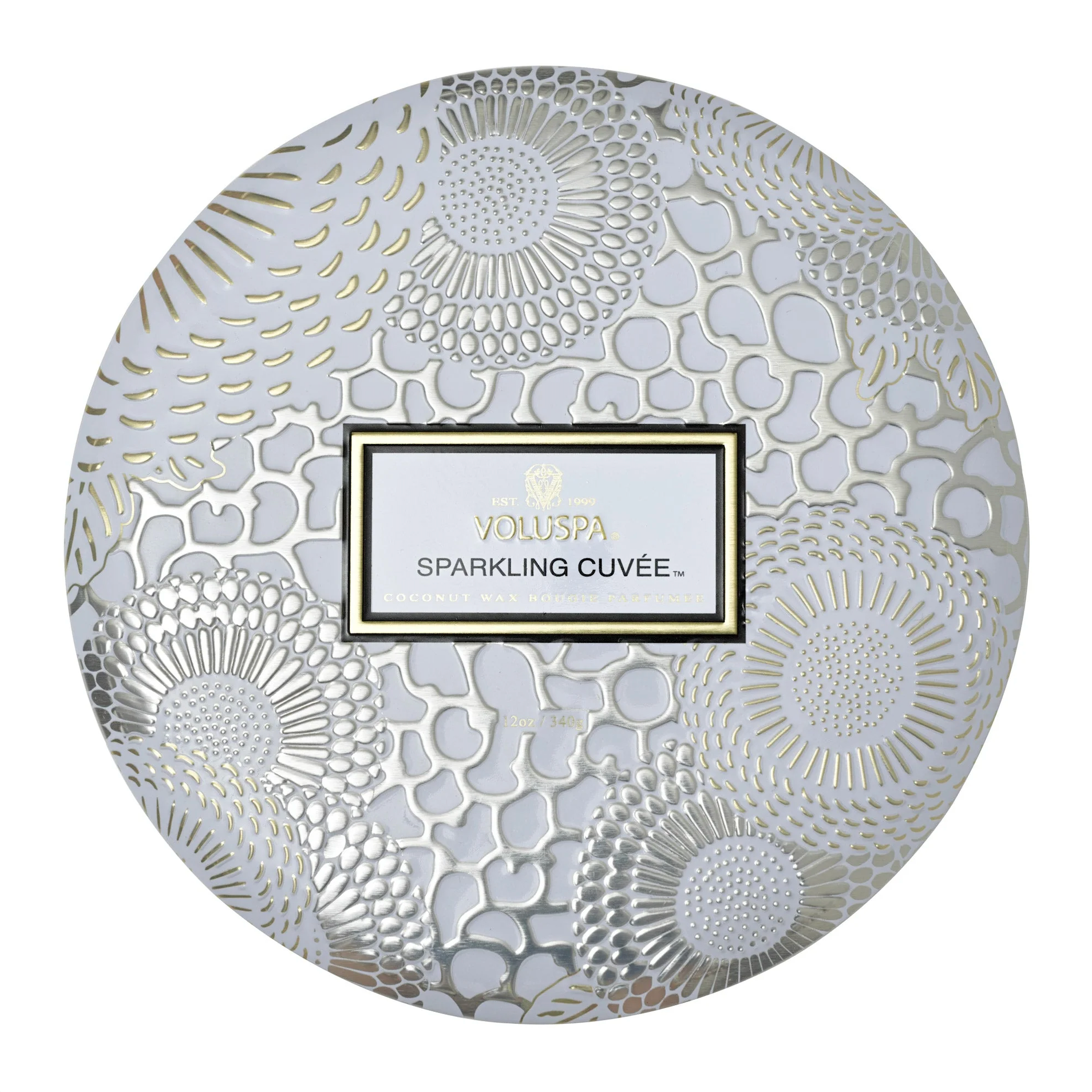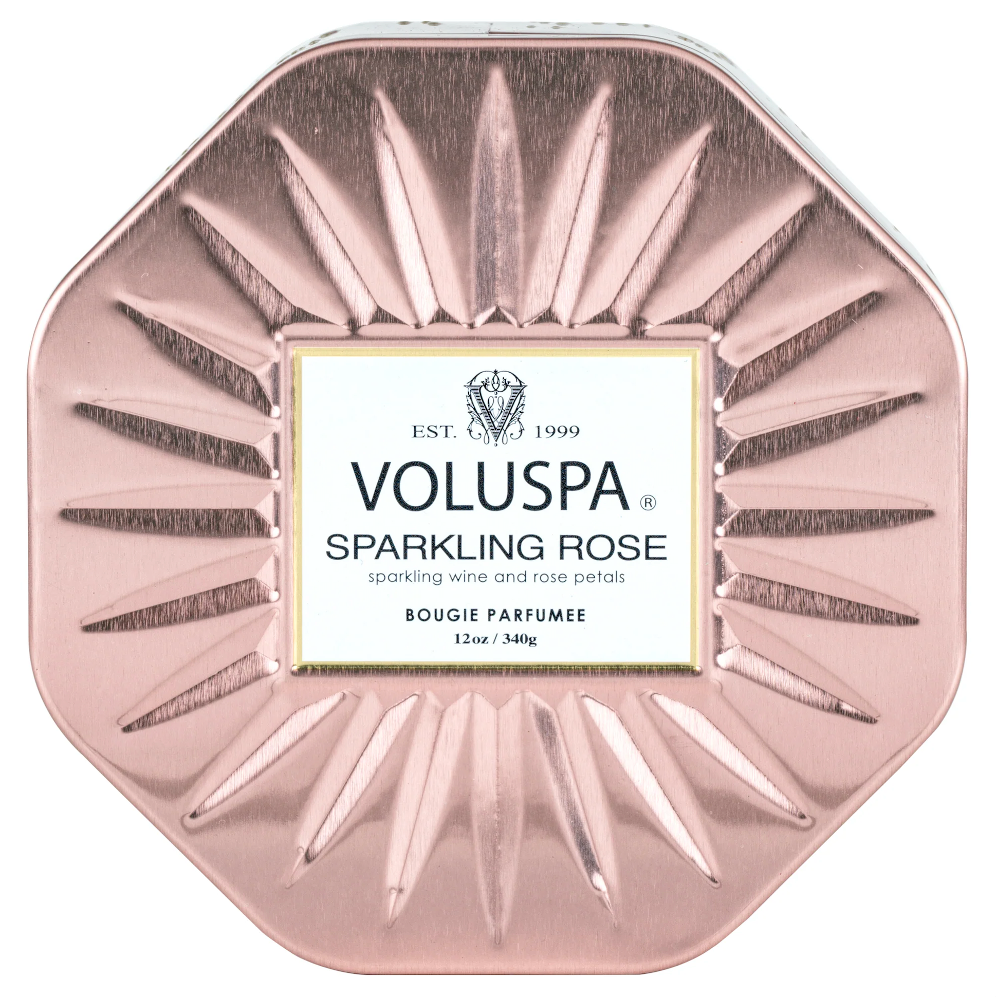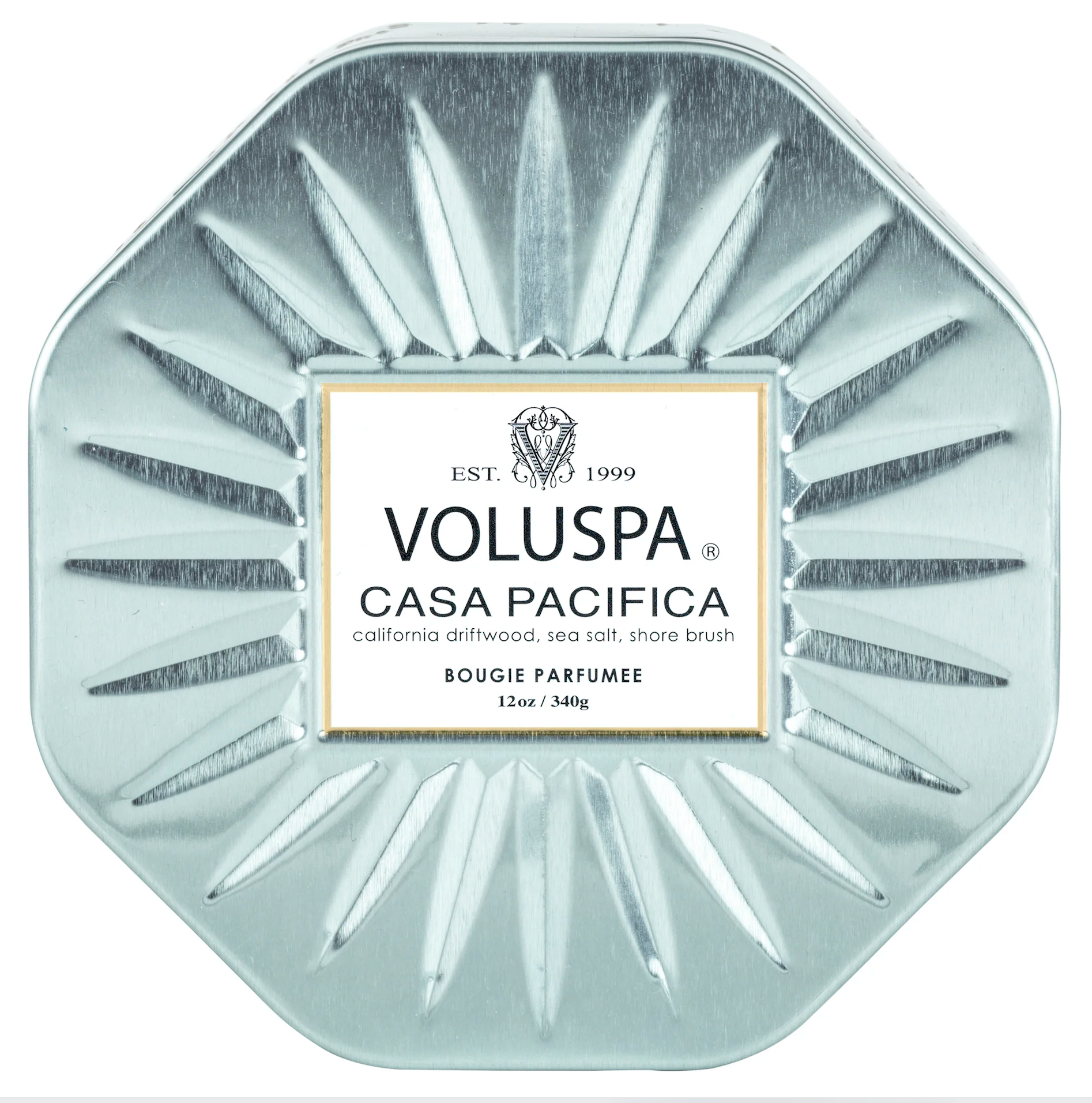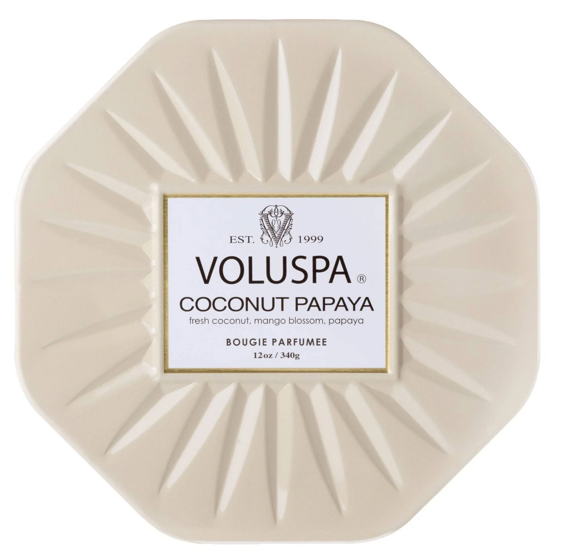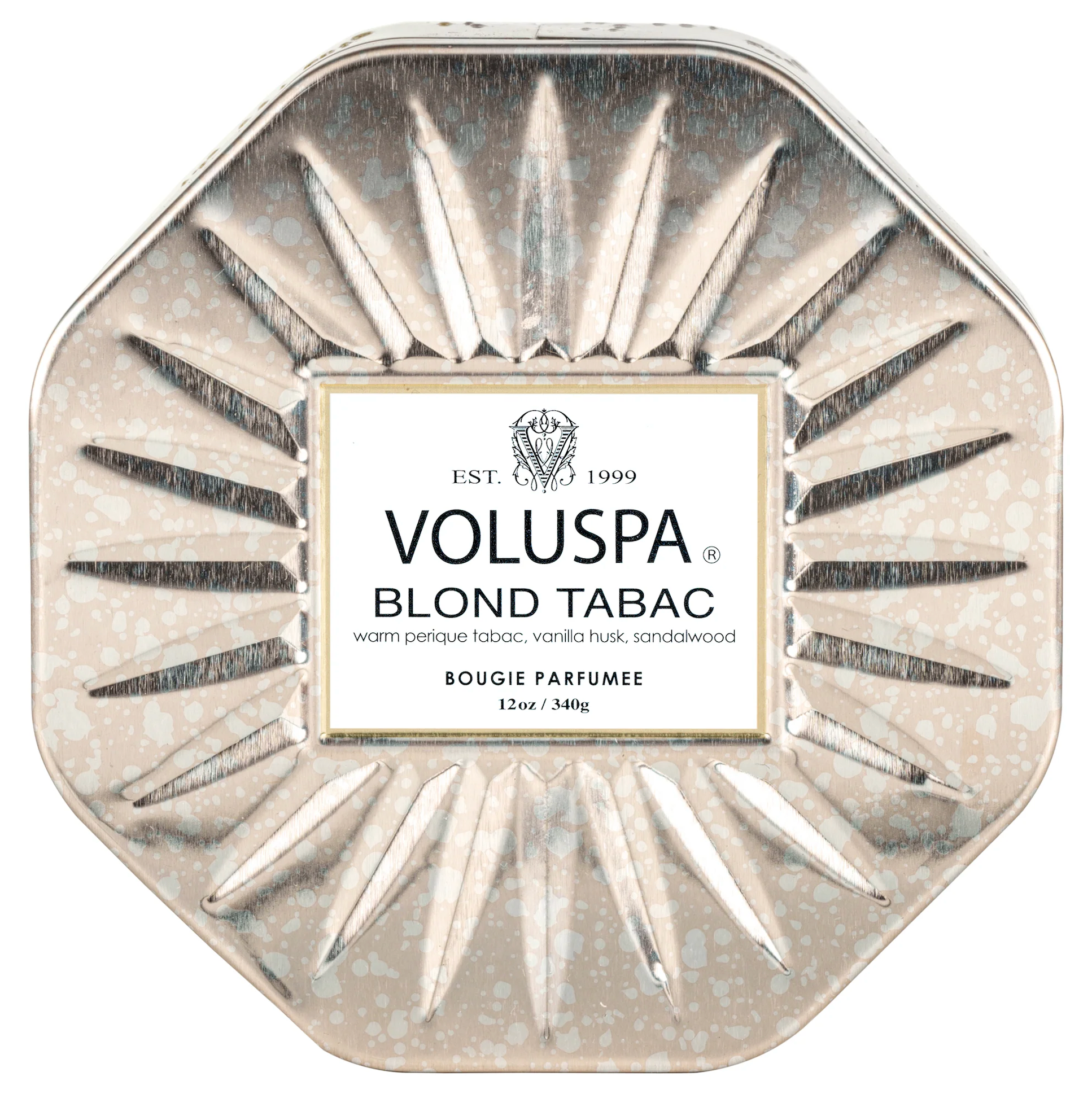 The Voluspa 3 Wick Tin Candle is a three wick coconut wax blend candle that is hand-poured into a 12 oz. metal vessel adorned in Maison pattern and topped with a matching lid that keeps the candle dust-free when not in use.