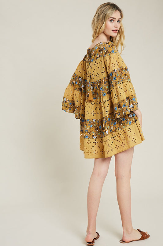 This easy swing dress blends comfort with standout style. Featuring a relaxed tiered silhouette, wide sleeves, and an allover artistic print, it moves beautifully while offering an effortless fit. Lightweight and breathable, it’s perfect for warm days, travel, or casual gatherings. Dress it up with boots or keep it simple with sandals for a look that feels both playful and refined.