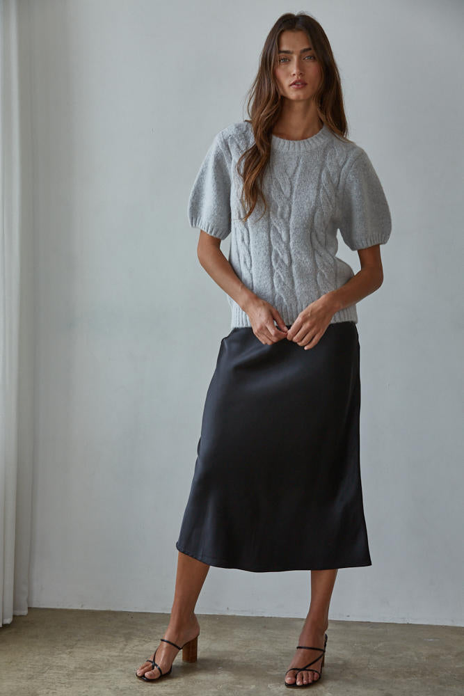 The Devon Pullover Cable Knit in soft grey blends timeless texture with modern details. Crafted from a cozy, stretchy knit blend (73% Acrylic, 14% Nylon, 10% Wool, 3% Spandex), it features a classic cable knit design, short puff sleeves, and a round neckline for a feminine yet polished look.