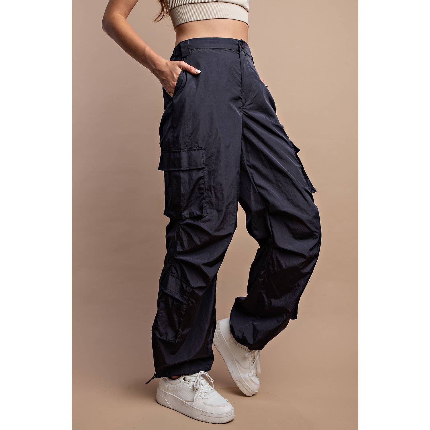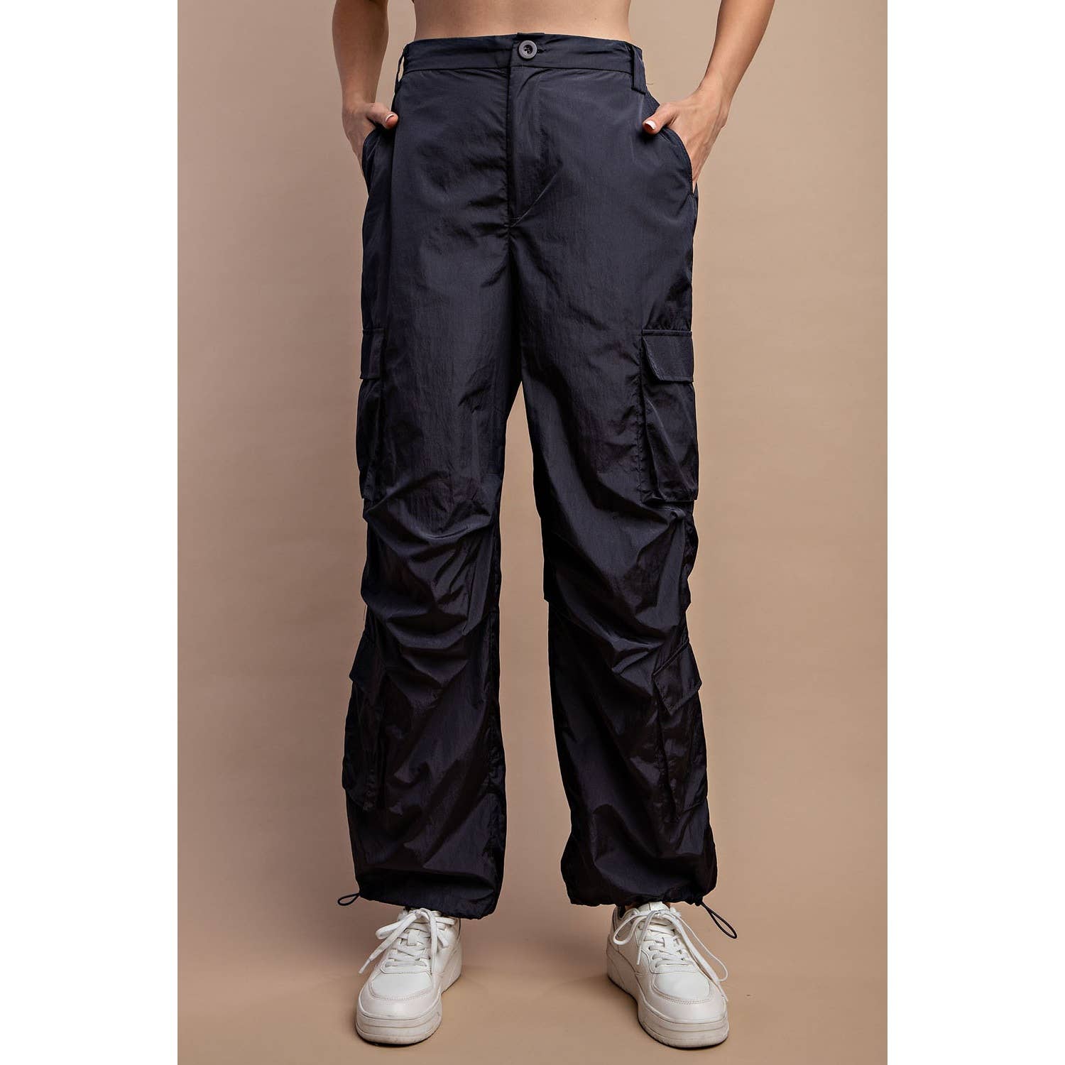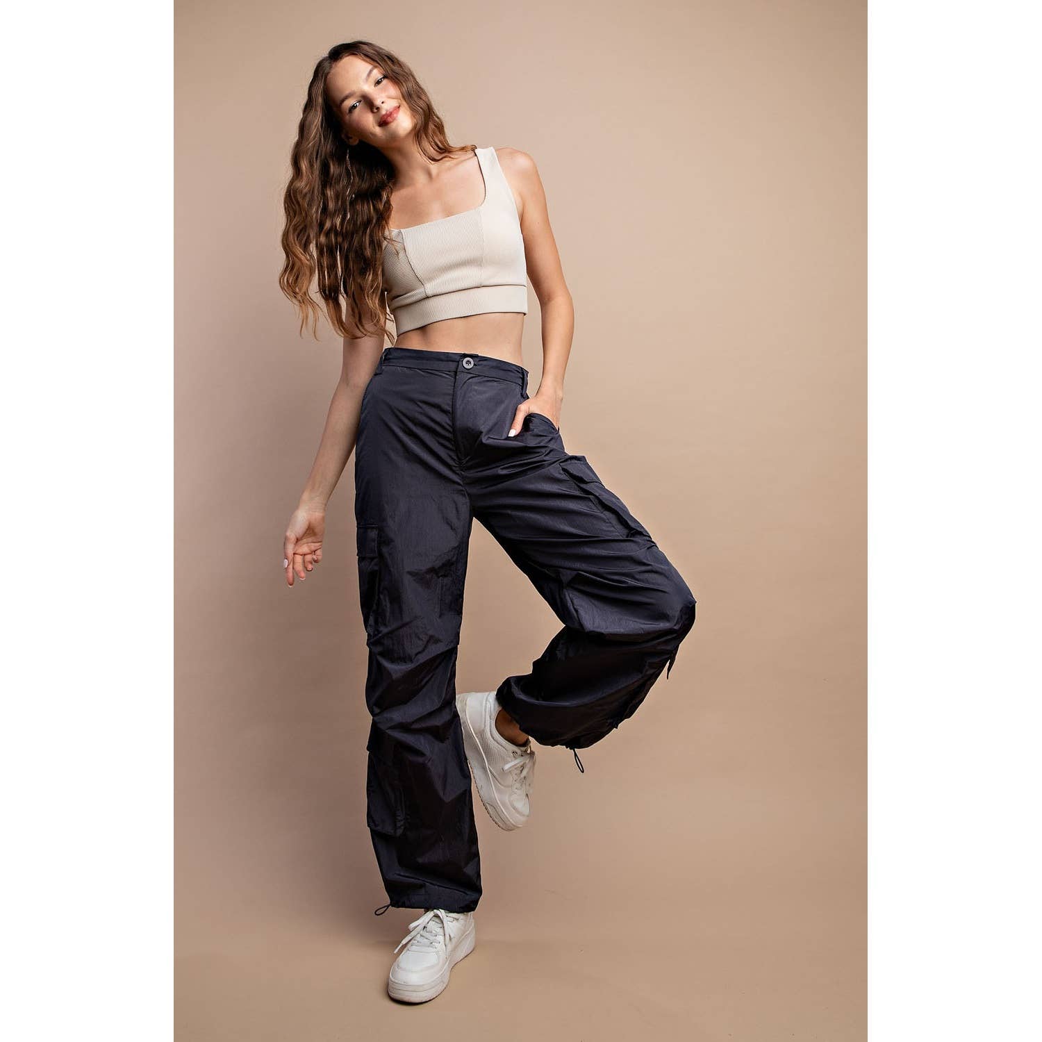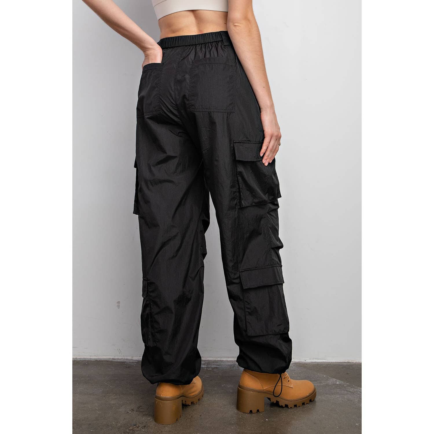 PARACHUTE CARGO PANTS - Balloon Cargo Pants - Drawstring - Back Pockets - Side Pockets Model is 5'9" and wearing size Small. Fabric Content: 100% Nylon