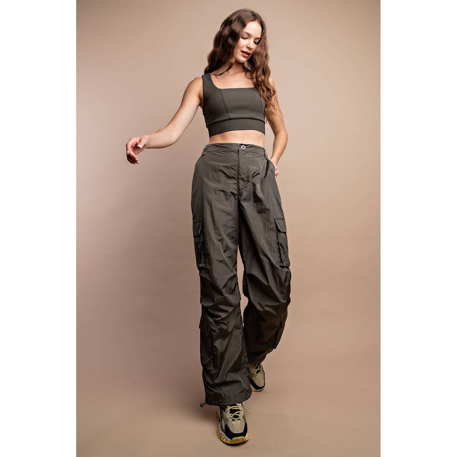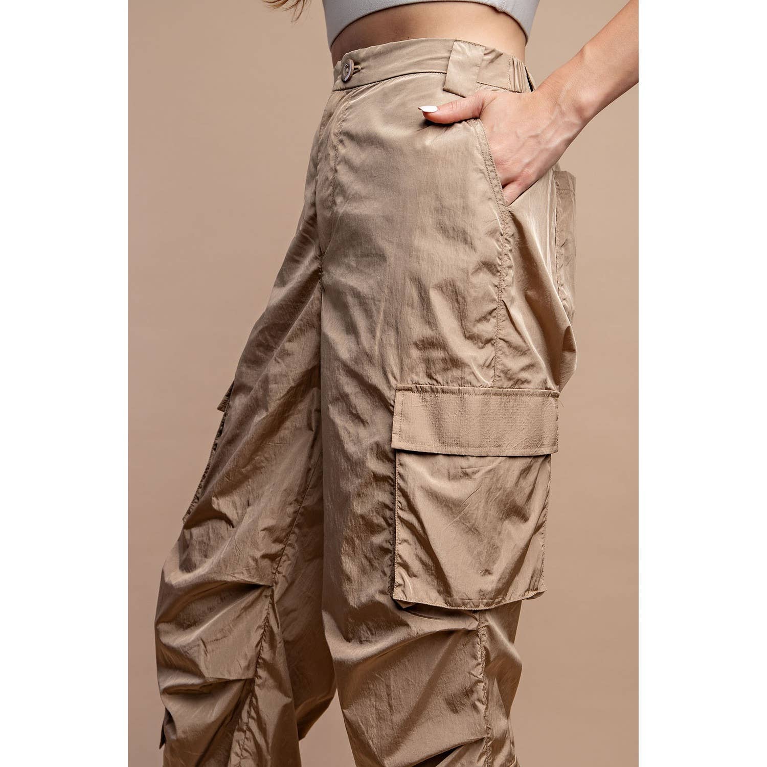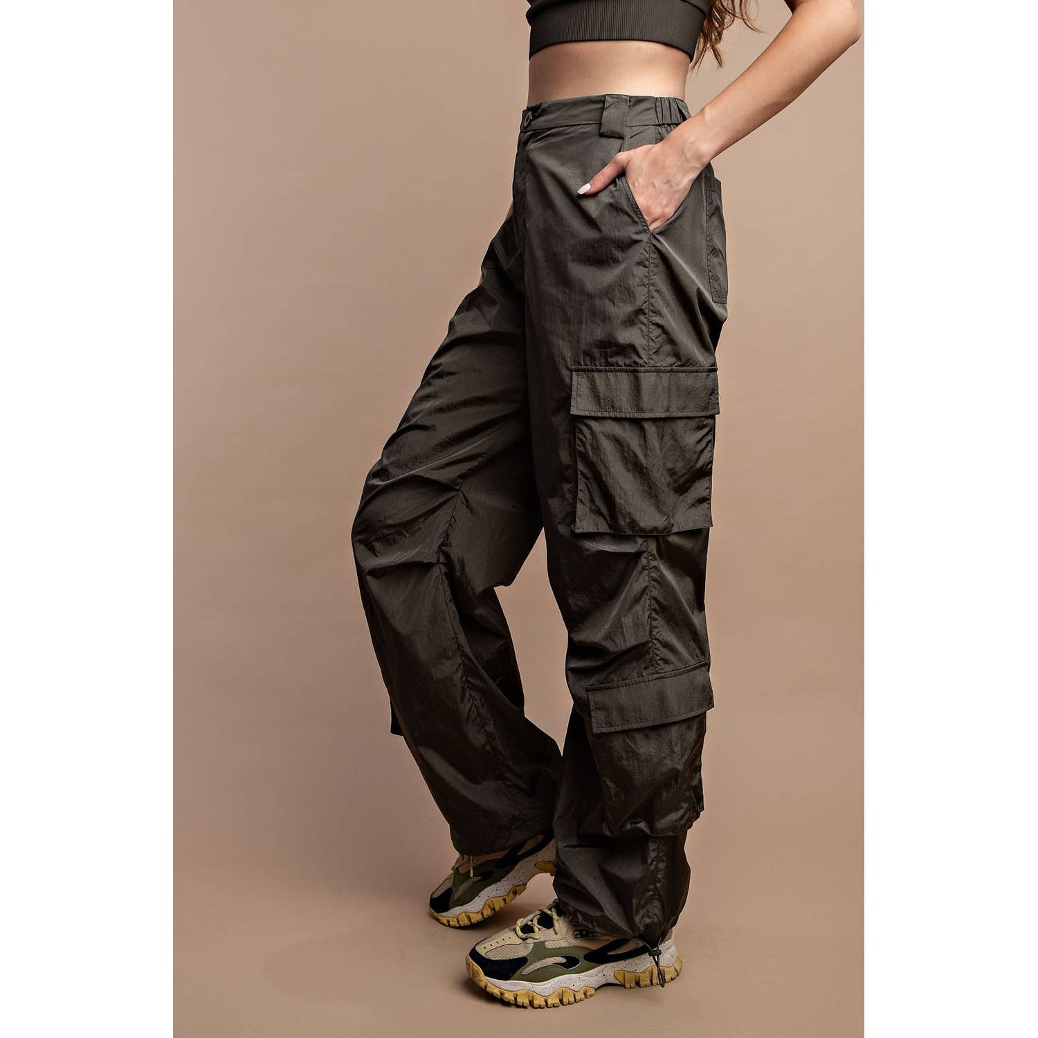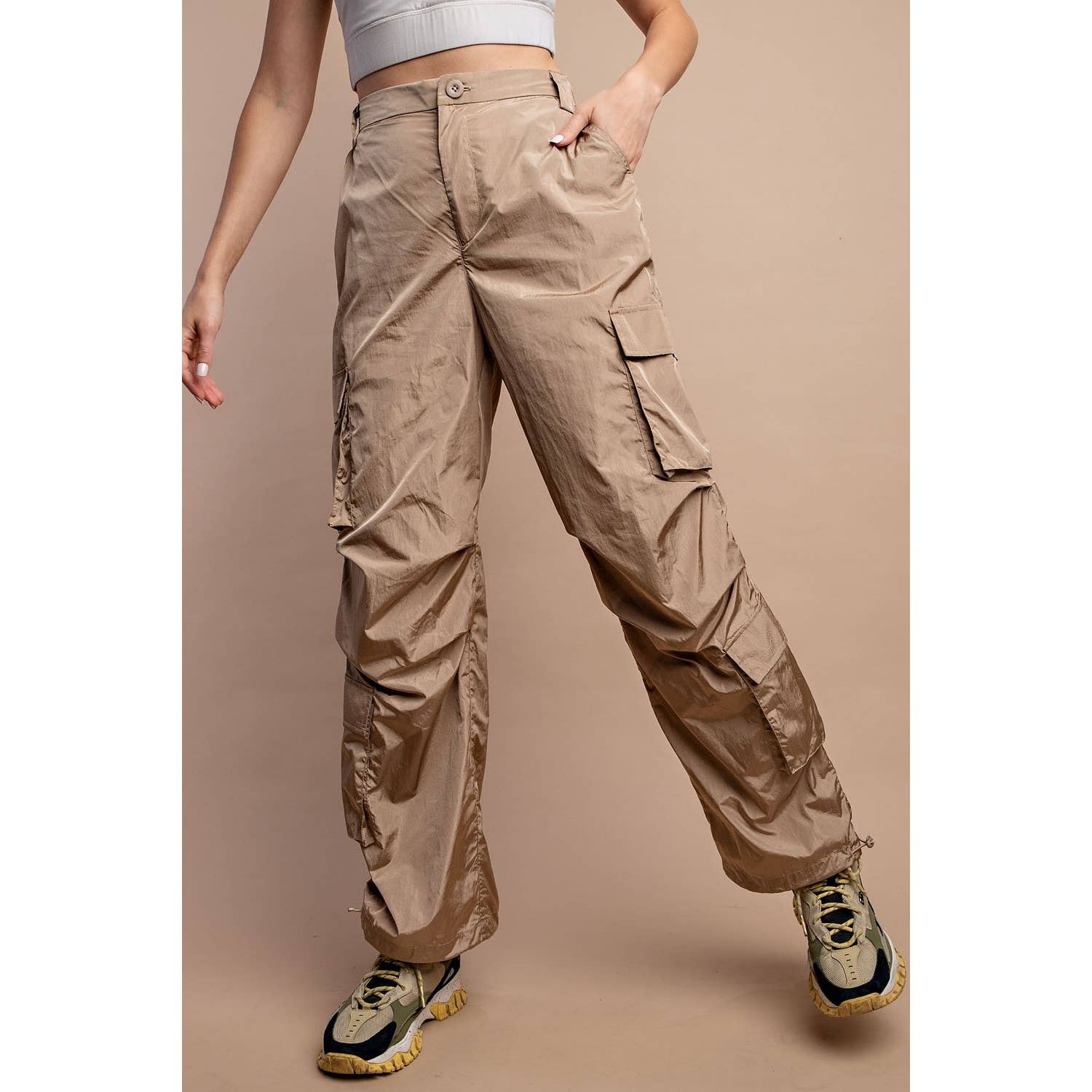 PARACHUTE CARGO PANTS - Balloon Cargo Pants - Drawstring - Back Pockets - Side Pockets Model is 5'9" and wearing size Small. Fabric Content: 100% Nylon
