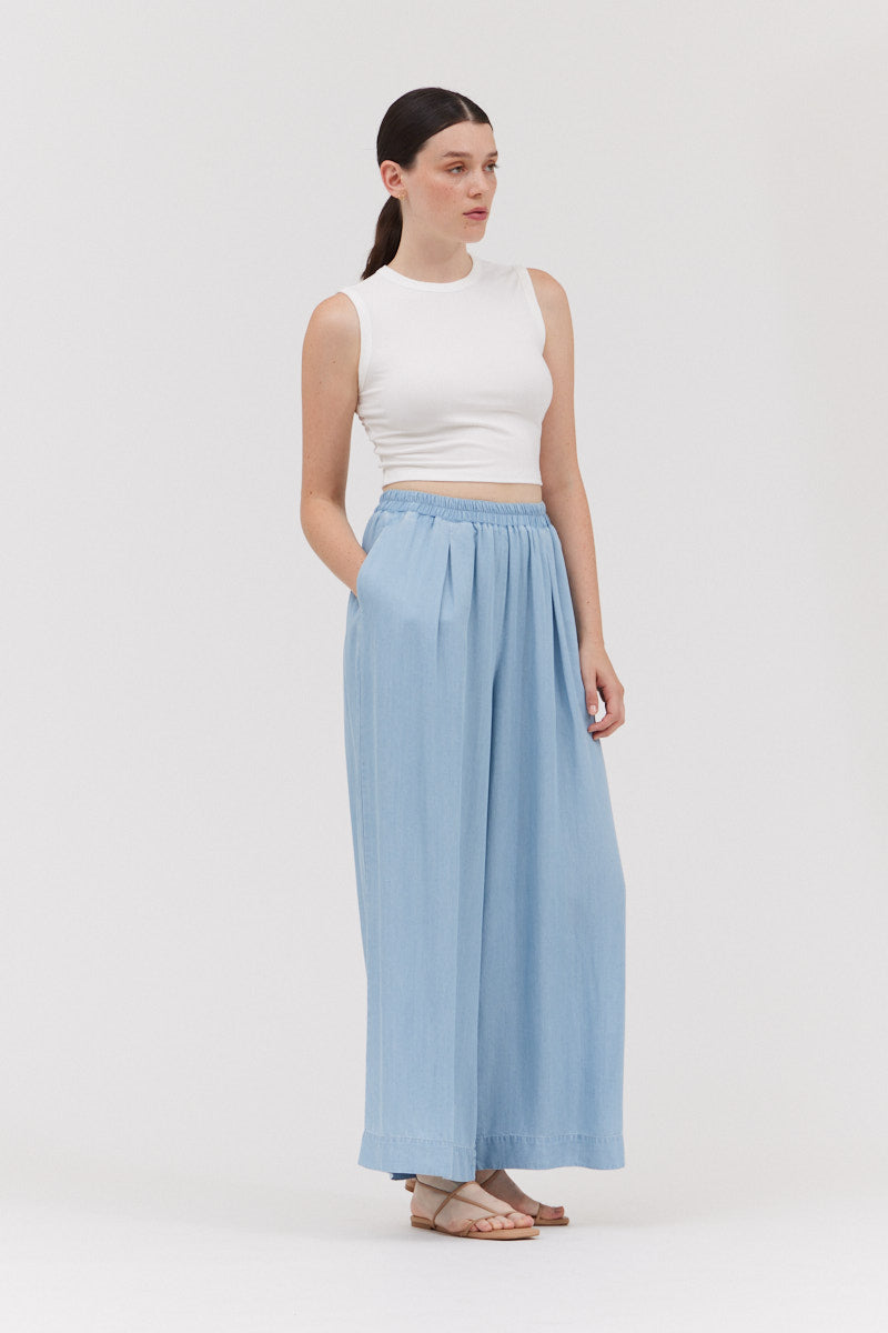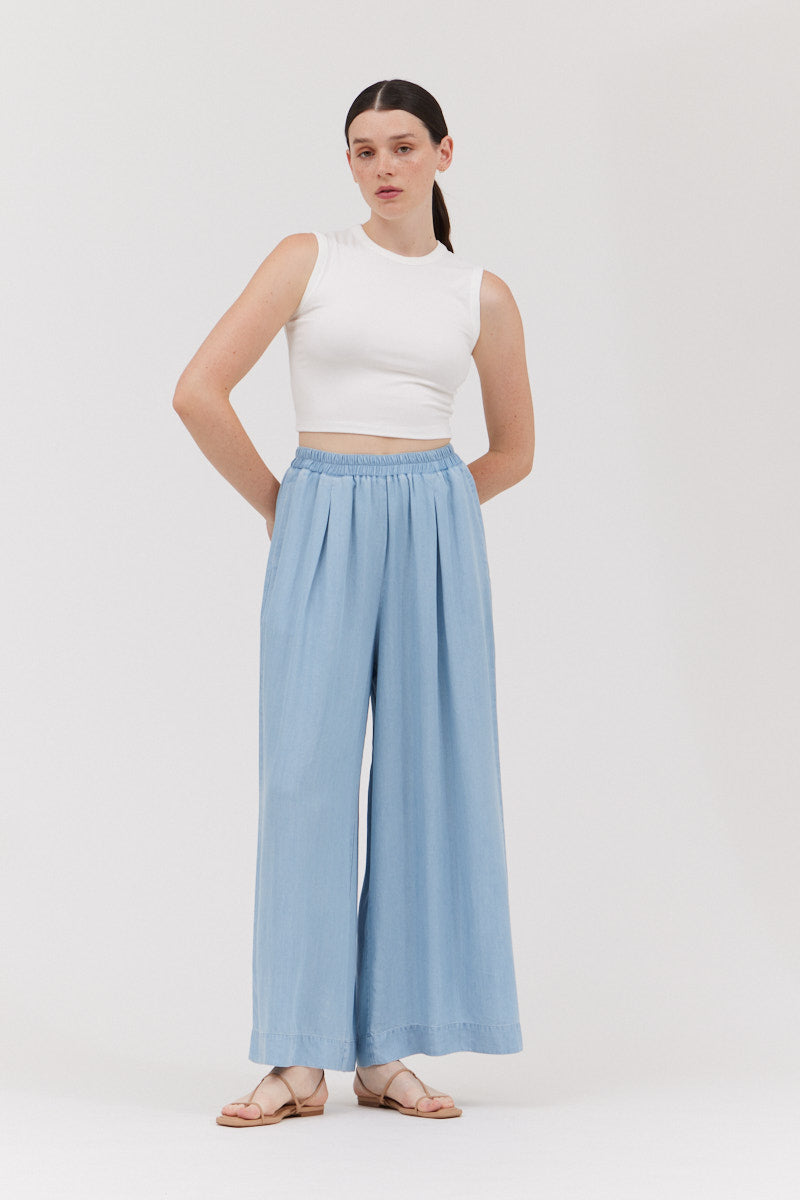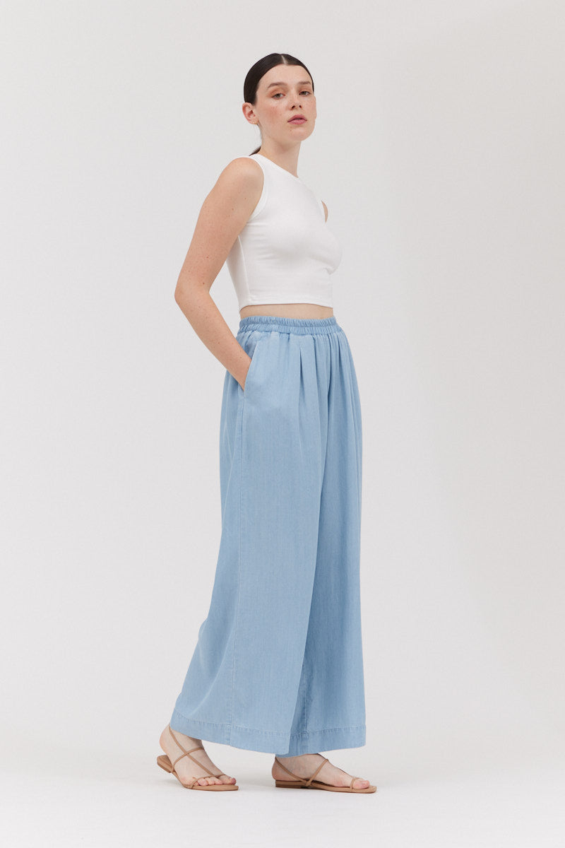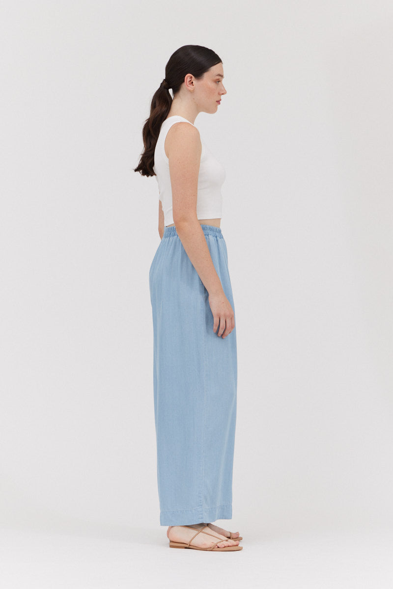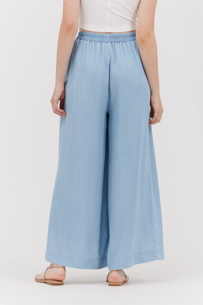 Refresh your wardrobe with our women’s long blue chambray pants, featuring a classic wide leg cut and a soft, lived-in texture that blends comfort with effortless style. The lightweight chambray fabric offers the perfect balance between casual and polished, making it ideal for layering or wearing solo.