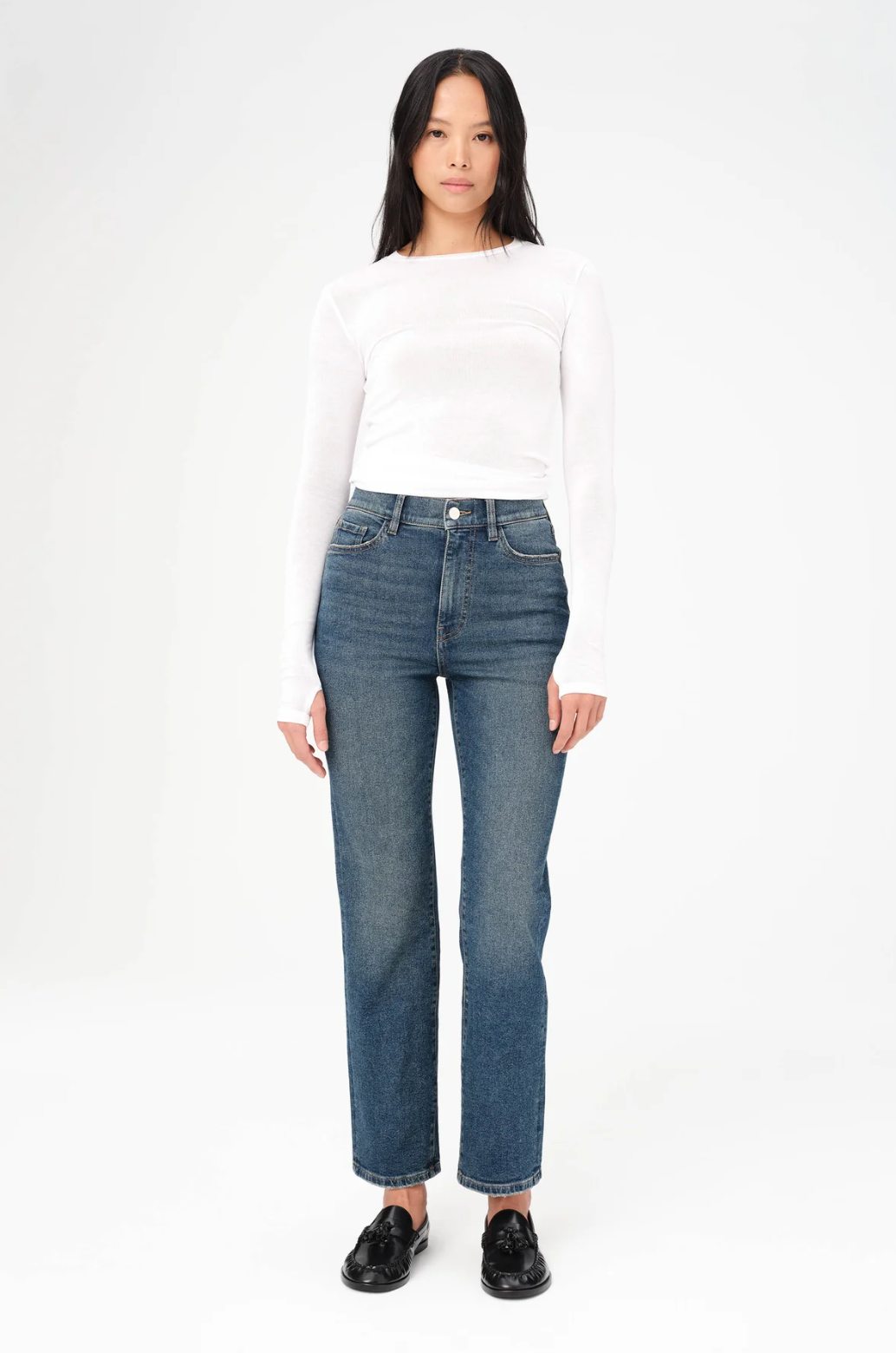 This is the perfected the high-rise, vintage-inspired straight leg jean. ASE flows straight from the thigh for maximum flattery and features a straight waistband, making it the perfect companion to your favorite crop tops and bodysuits. "Everafter" is a light, vintage wash with authentic fading throughout. It features silver hardware and a clean hem.