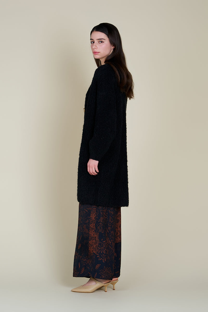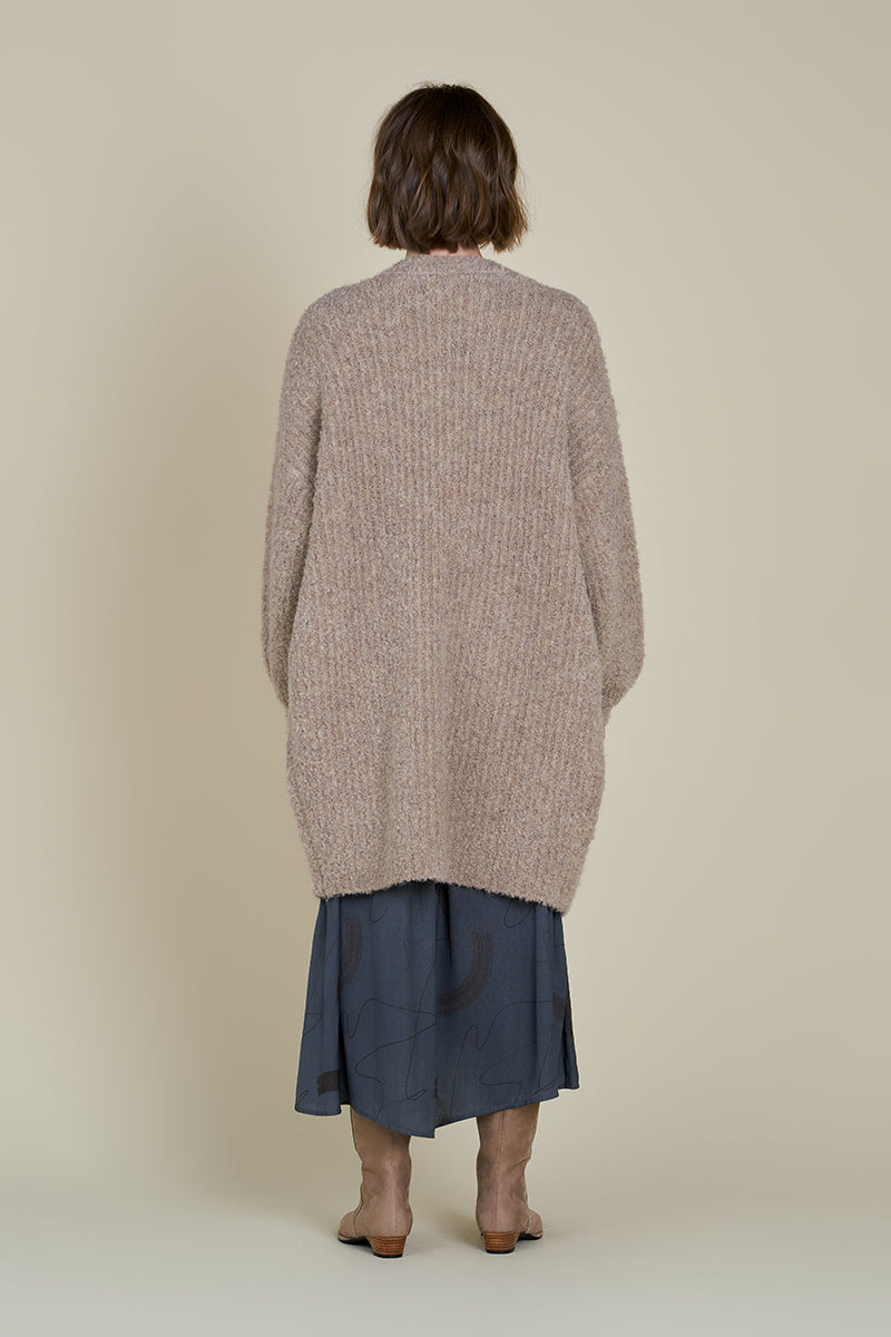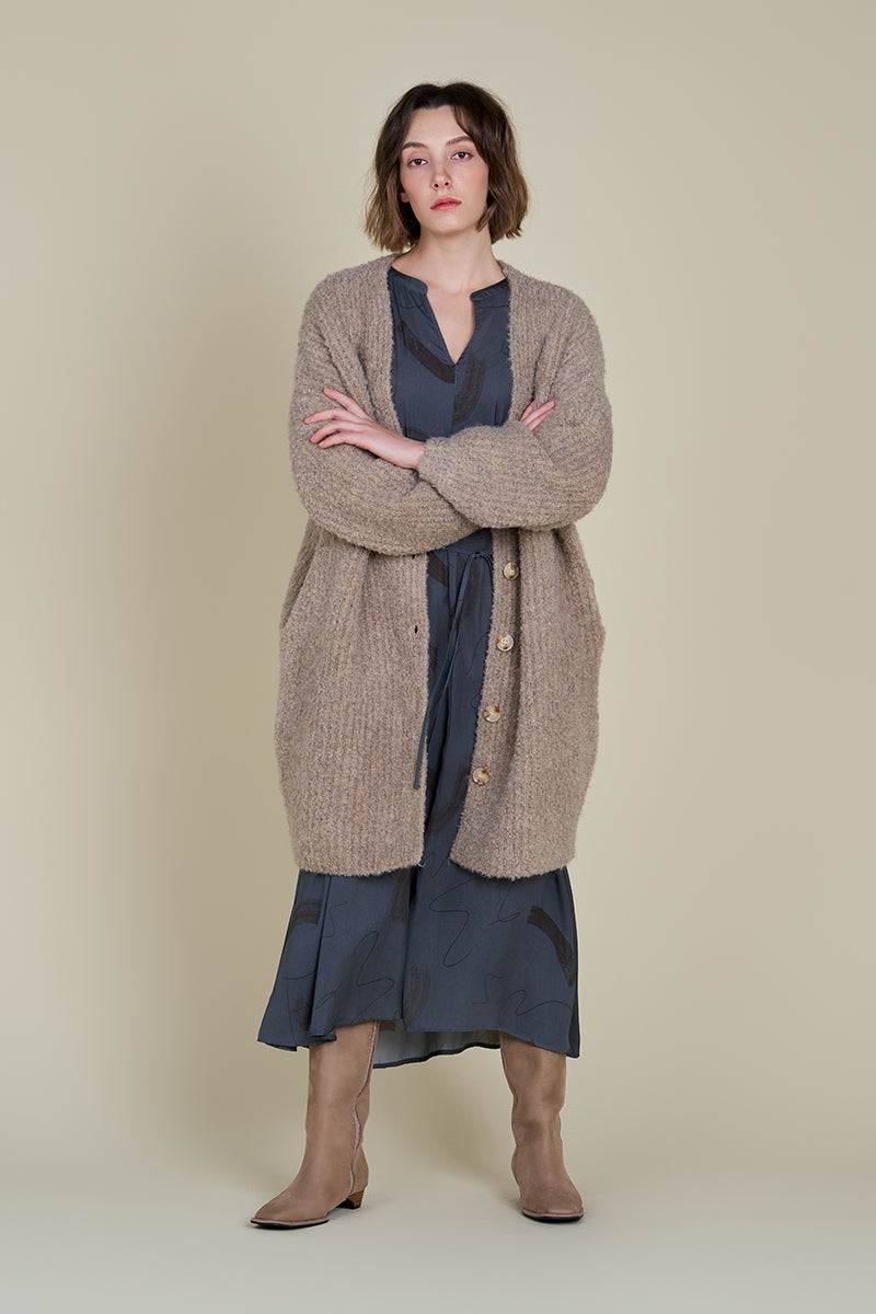 Long textured Cardigan with buttons up the front for warm cozy vibes. The pockets and slight bubble sleeve add a bit more character to this classic! Dress up with a beautiful silk dress or stay more casual with Jeans and a graphic T-shirt + booties.