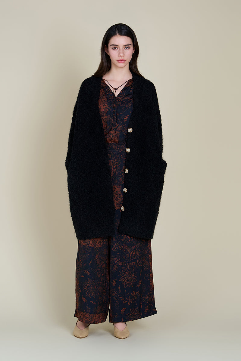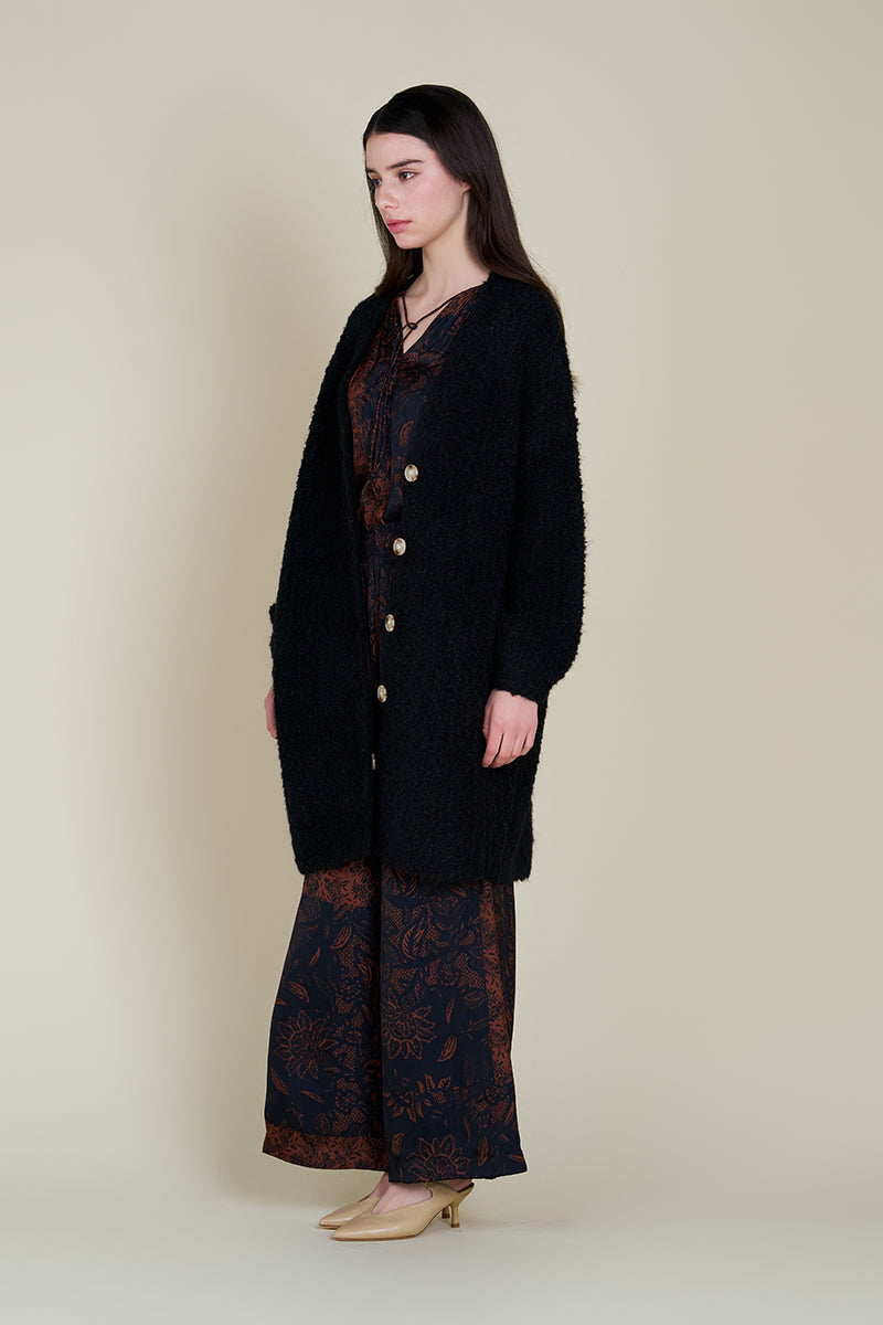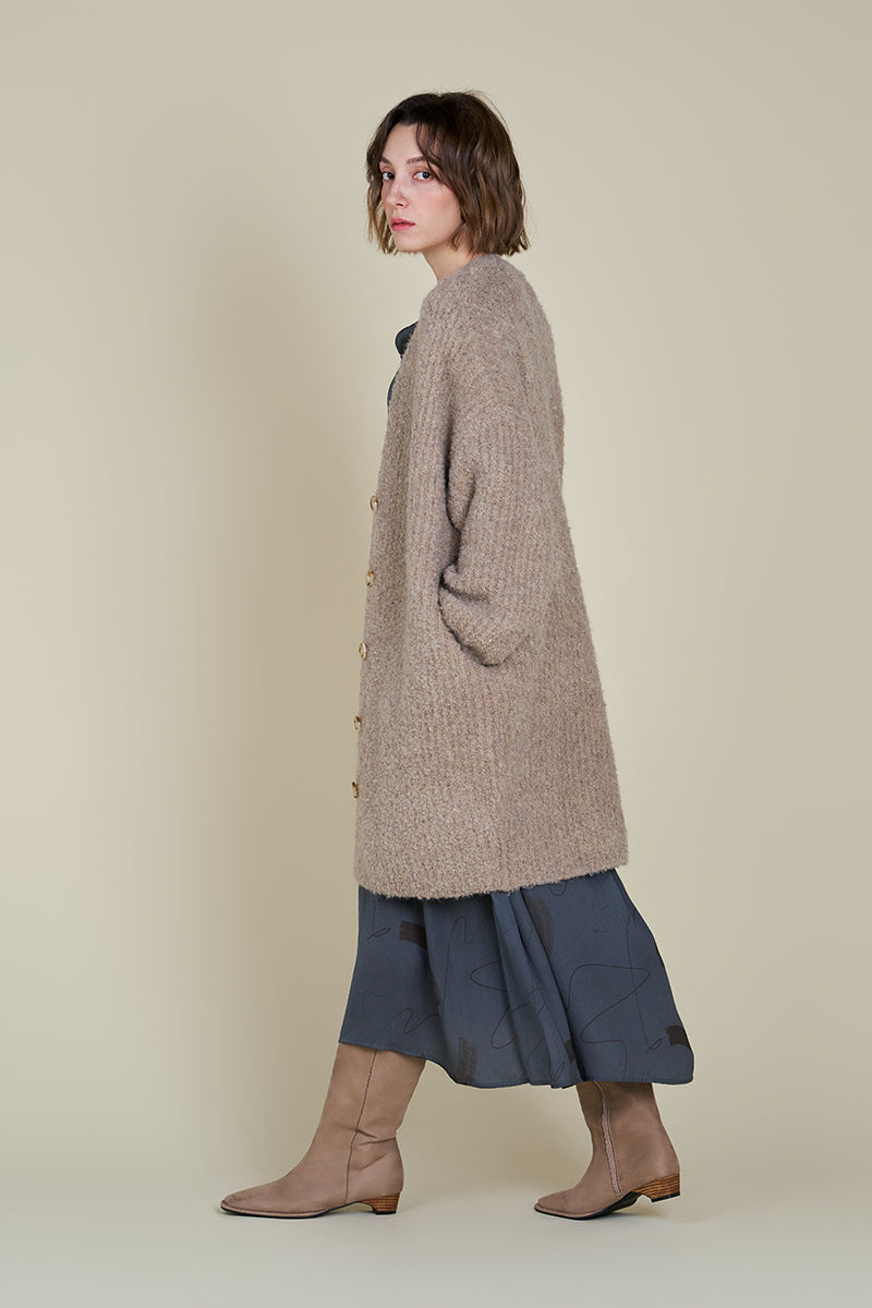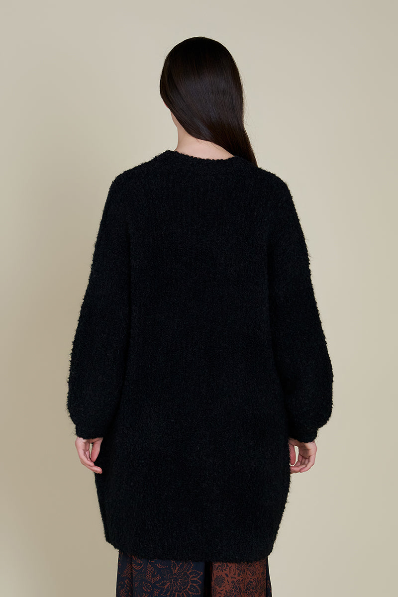 Long textured Cardigan with buttons up the front for warm cozy vibes. The pockets and slight bubble sleeve add a bit more character to this classic! Dress up with a beautiful silk dress or stay more casual with Jeans and a graphic T-shirt + booties.