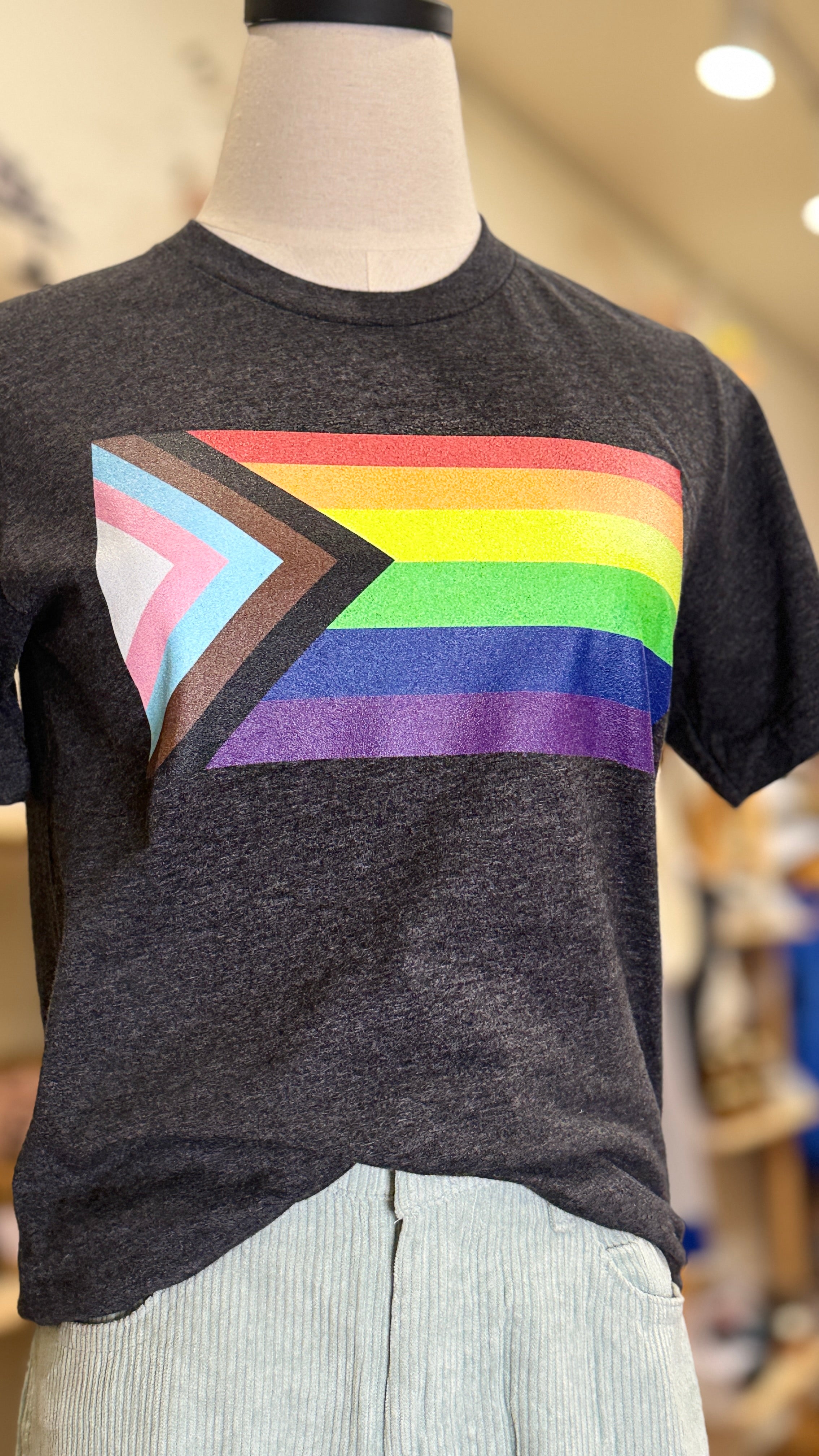 - Graphic tee featuring the Progress Pride flag