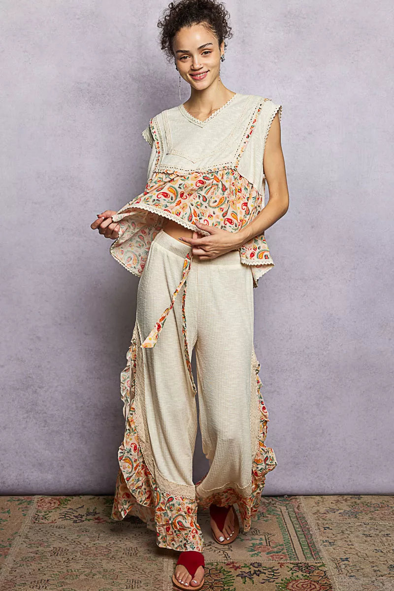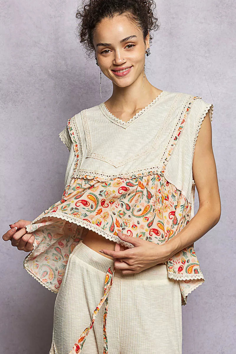 This sleeveless top is designed with a V-neck for a chic and flattering neckline. The relaxed fit provides comfort and ease of movement. Made from ribbed fabric, it offers texture and dimension to the look. The trim detail and ruffle accents add a touch of feminine charm. The pointed floral pattern adds a stylish and sophisticated element to this versatile piece.