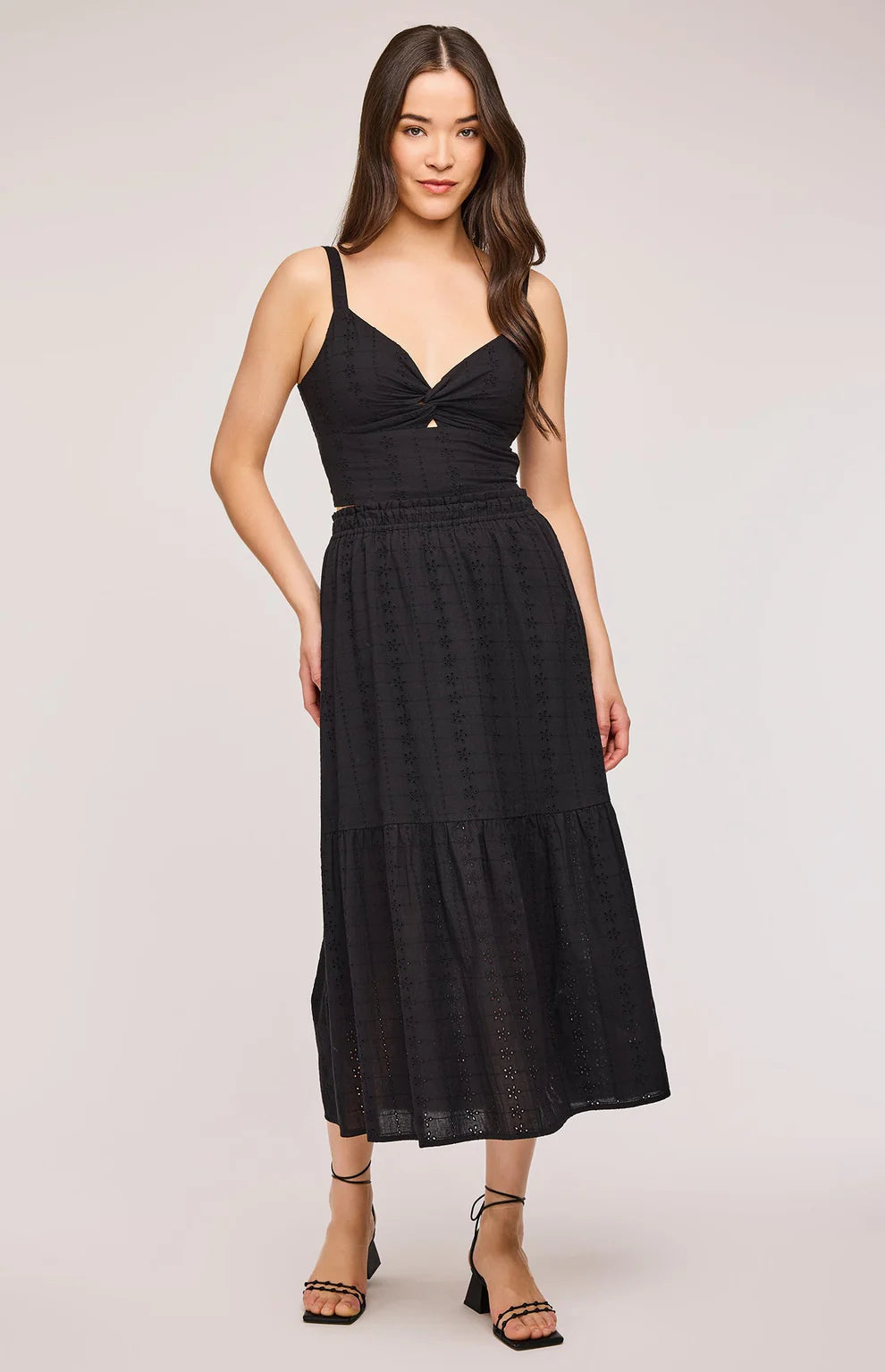 The Veronica tank is made of cotton fabric with floral eyelet embroidery. Features include adjustable straps, back smocking panel, and lining for ease of wear. Complete the look with the Madrid skirt.