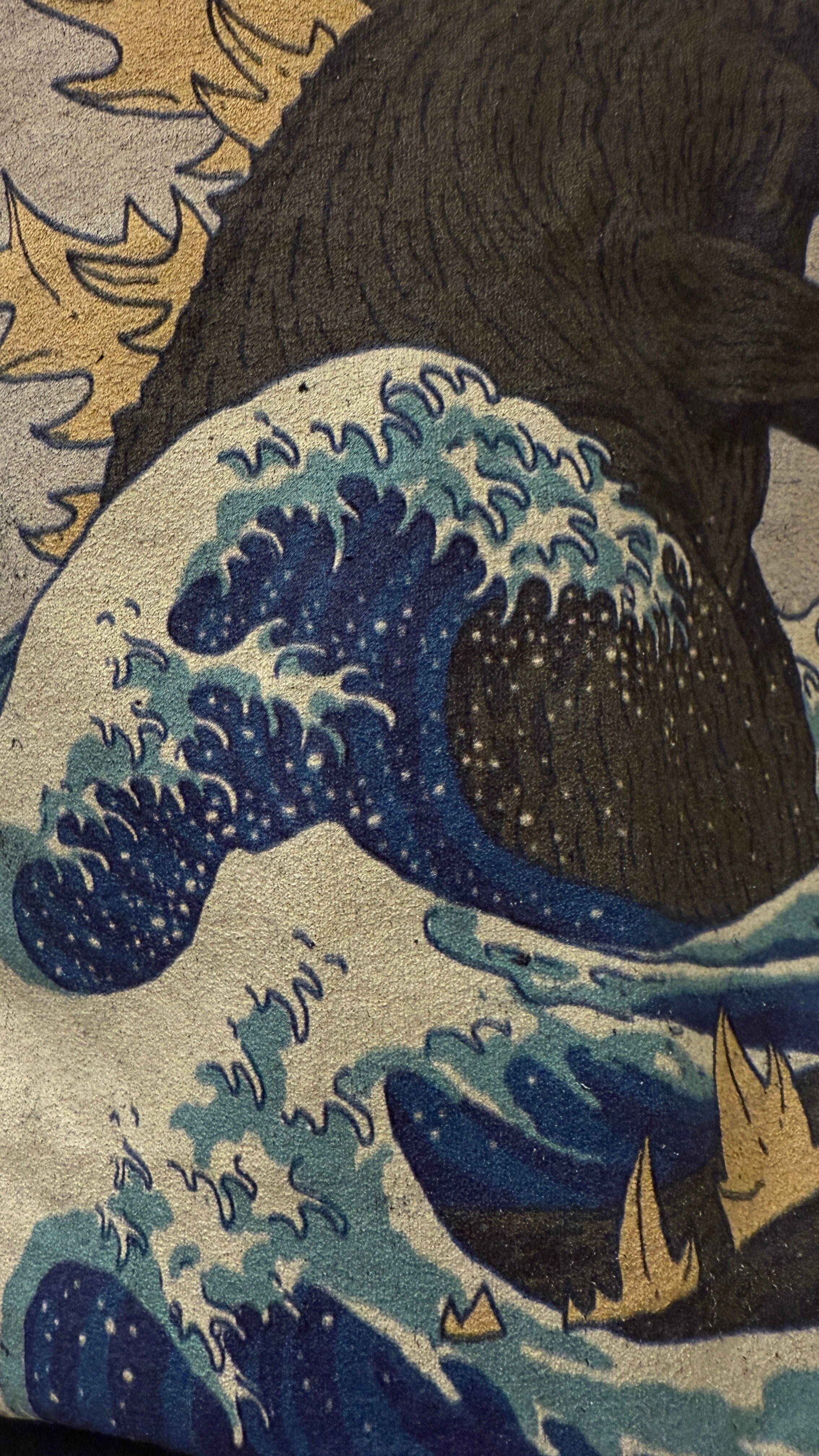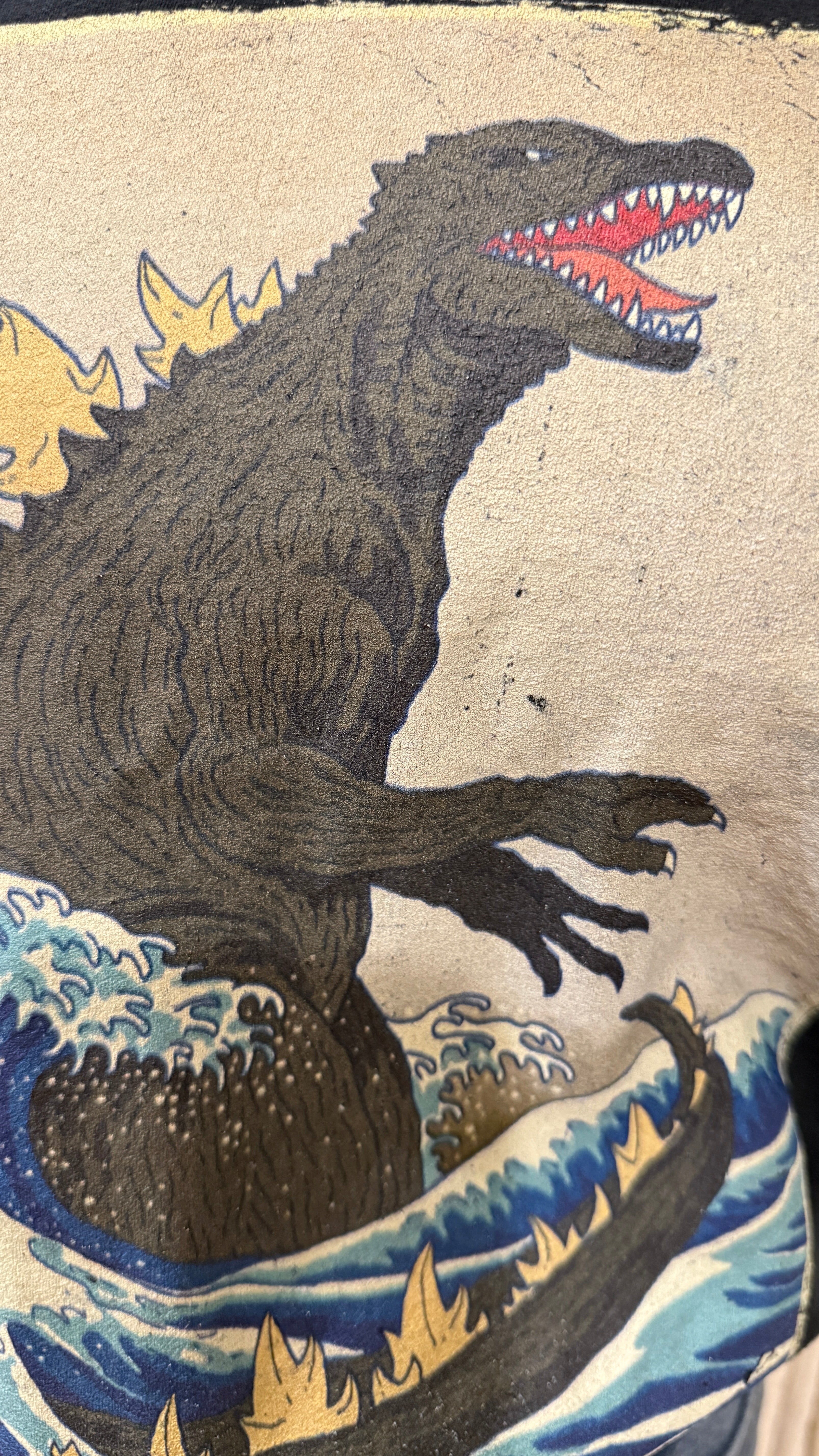 Godzilla Vs. The Wave is a bold, vintage-inspired graphic tee featuring a striking Godzilla illustration set against a classic wave motif. This black graphic t-shirt has a soft, lived-in feel with subtle wear that adds authentic character. An art-forward statement piece that pairs effortlessly with denim, tailored trousers, or layered under a jacket for everyday edge.