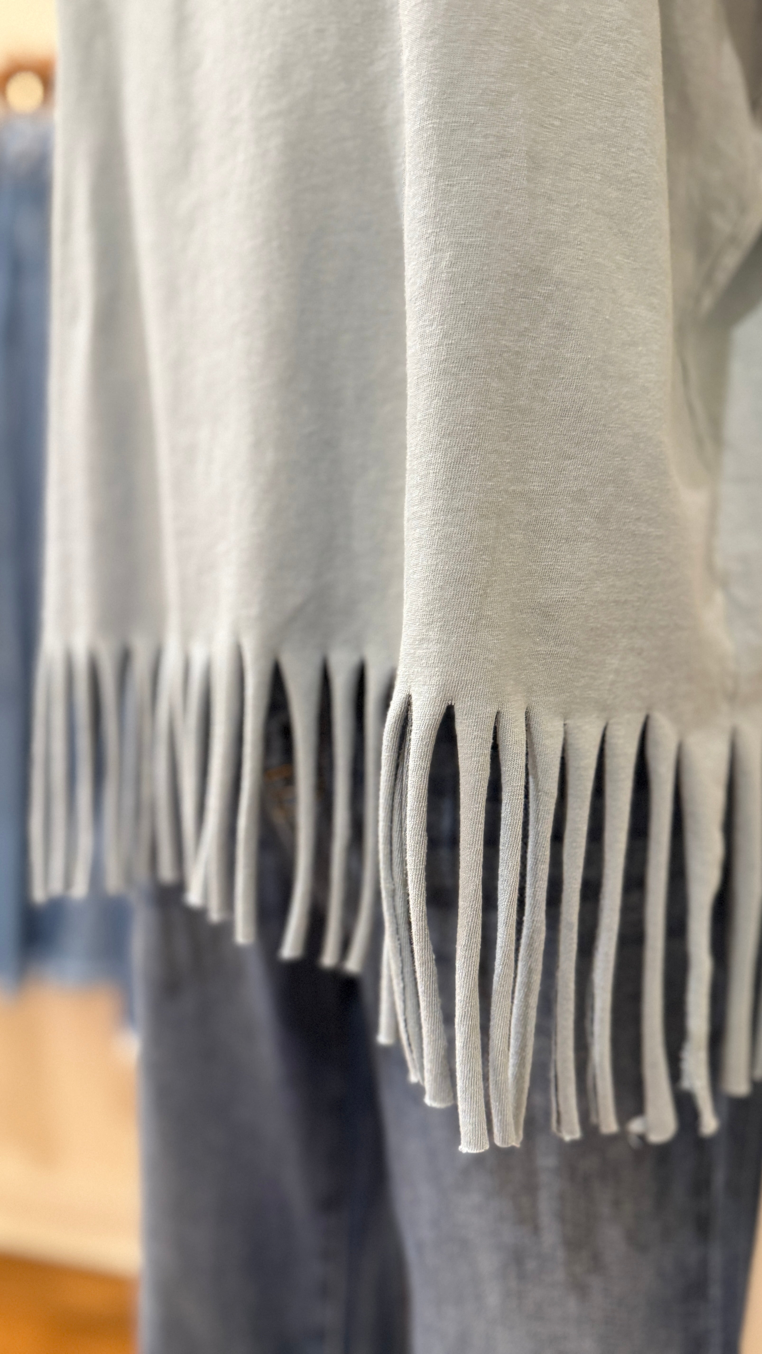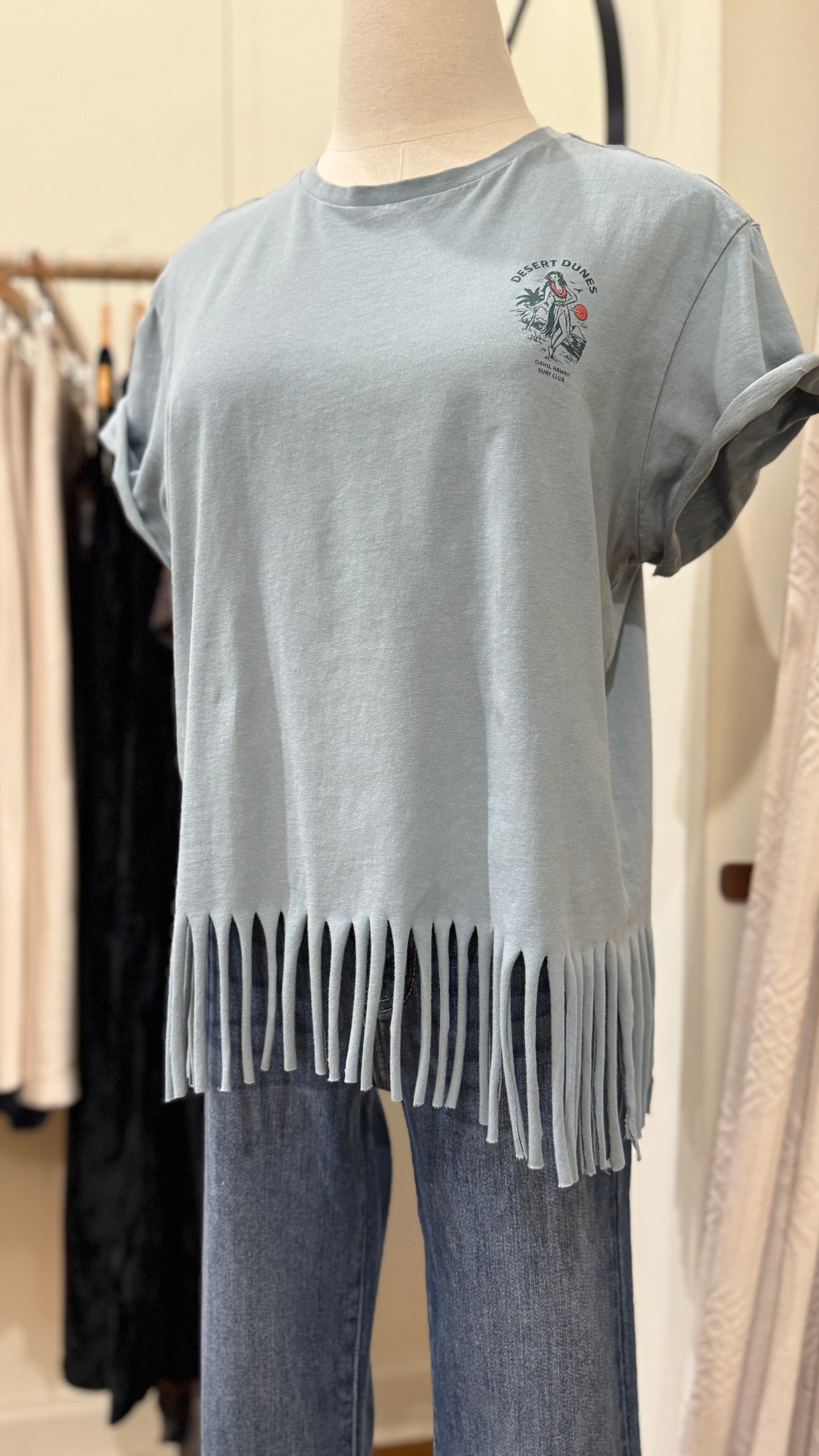 This classic tee was given a modern update with rolled sleeves and a flirty fringe hem and for a fun, nod to the hula skirt!