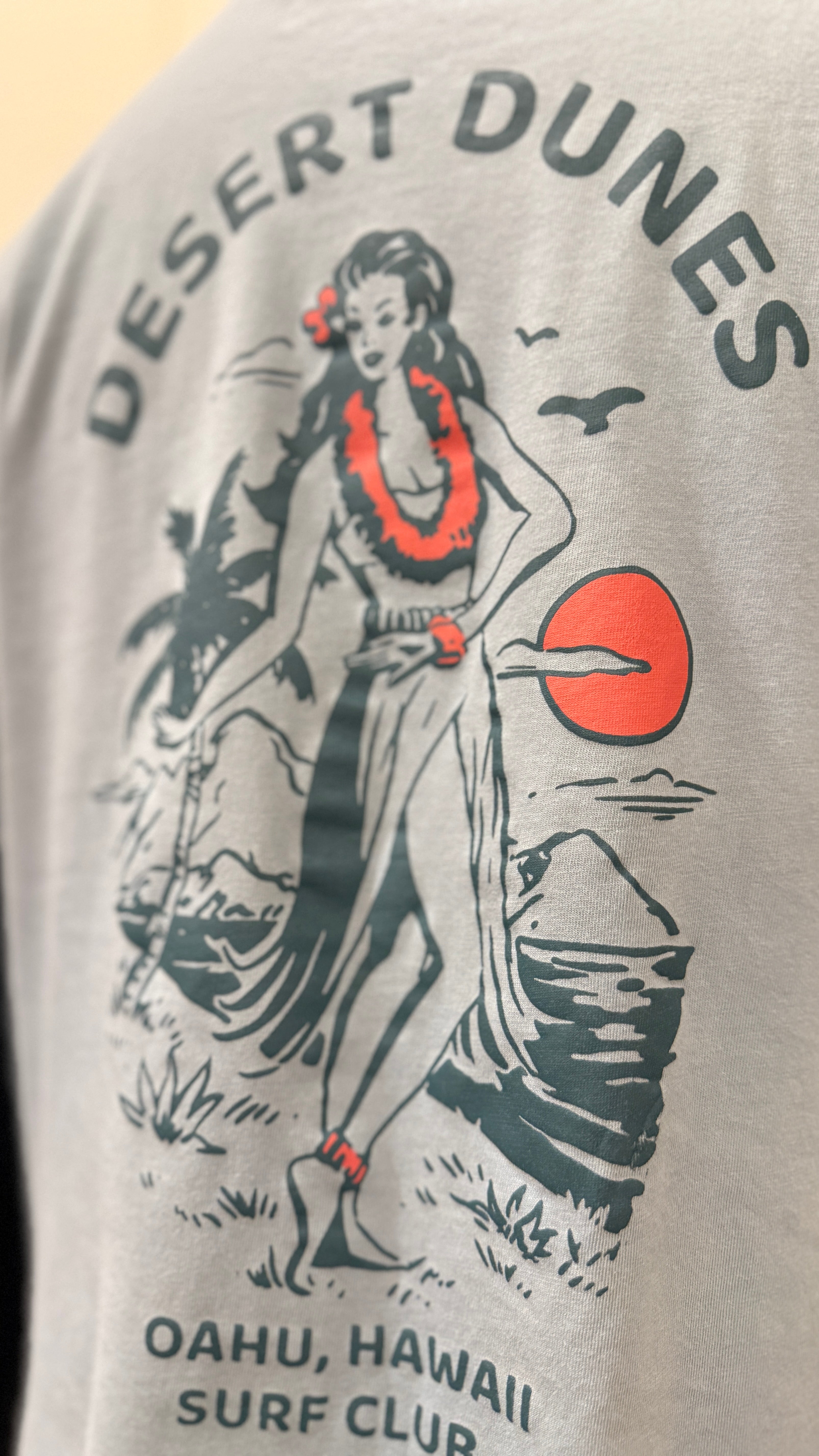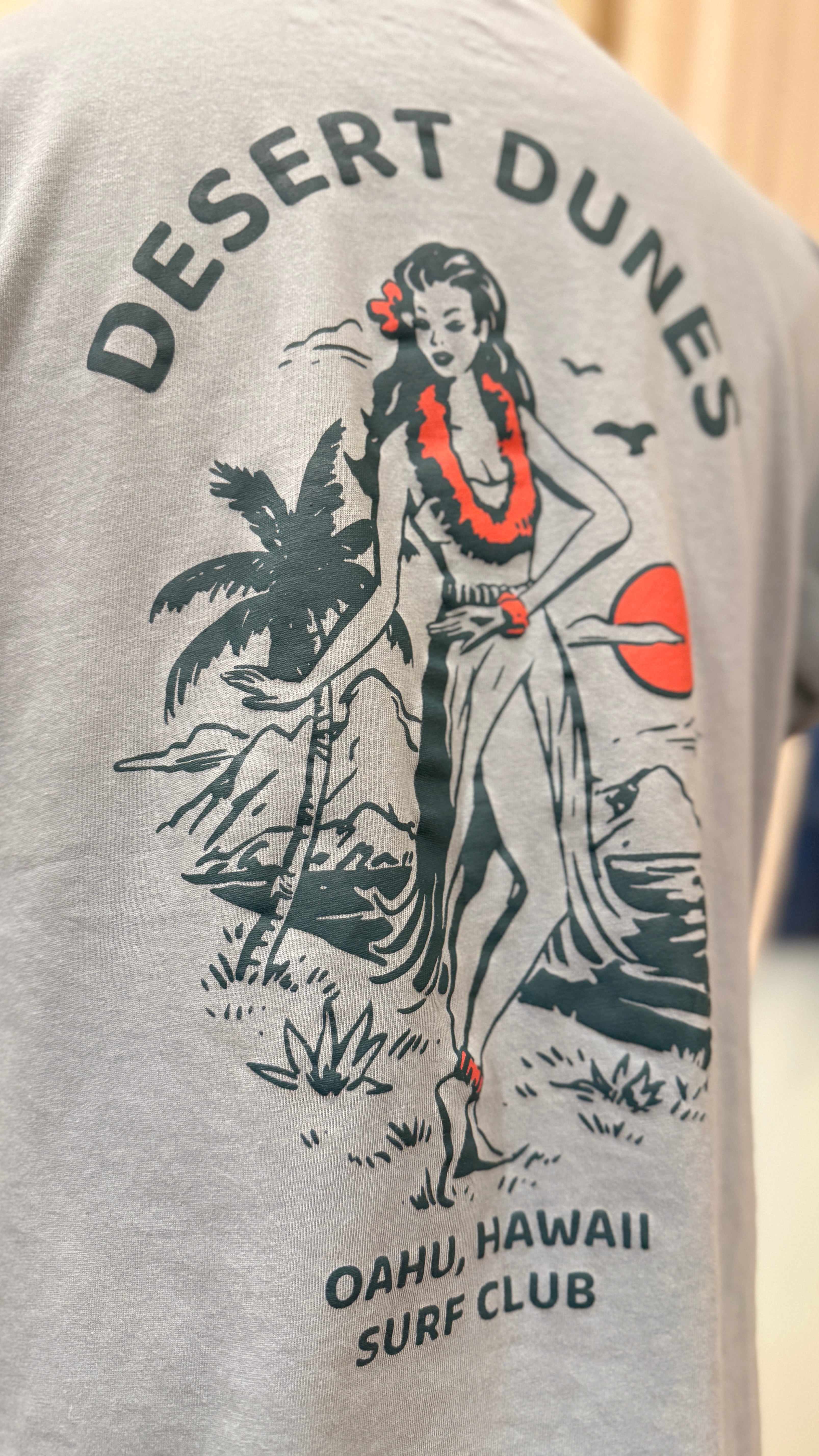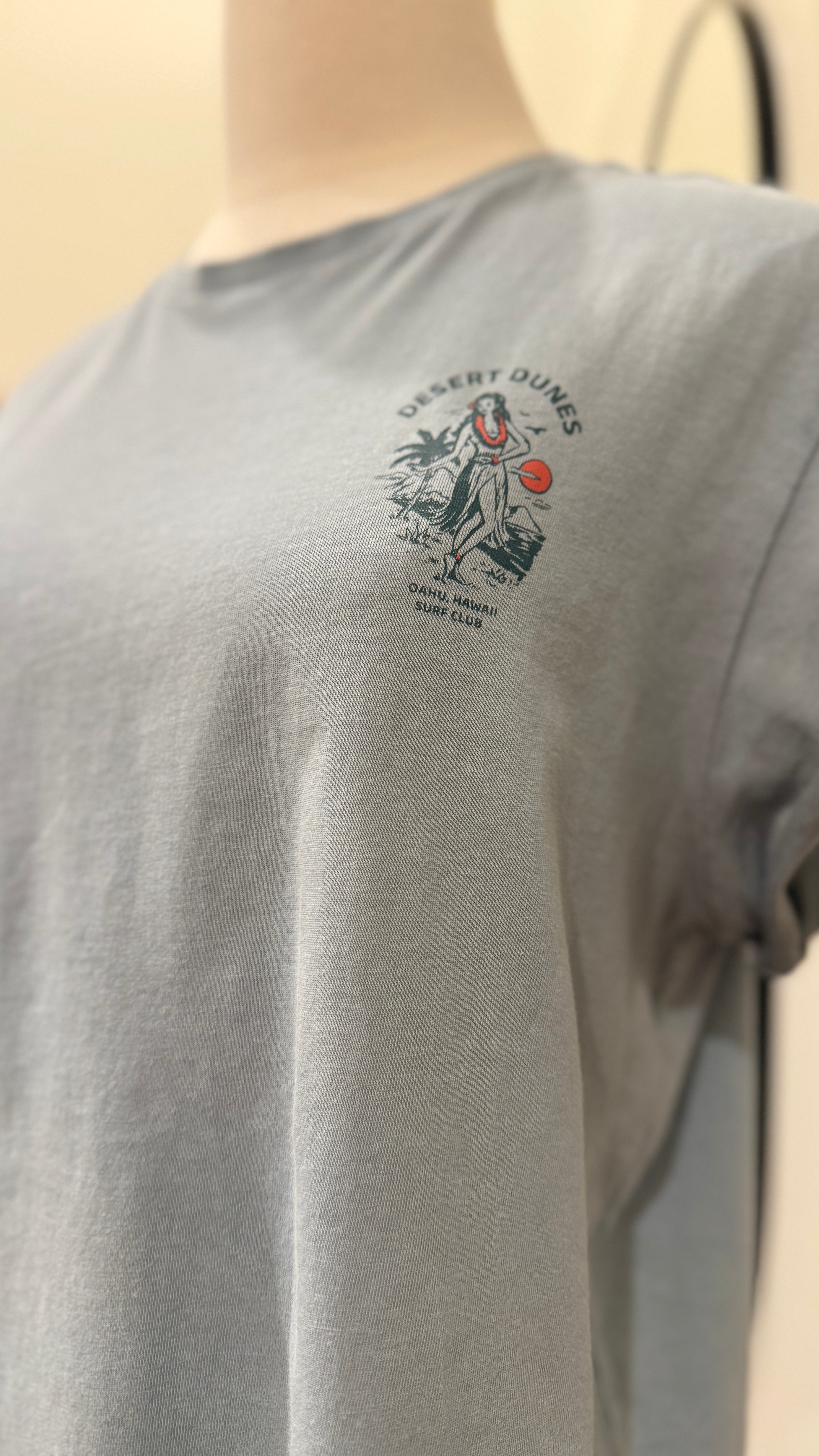 The playful “Desert Dunes: Oahu Hawaii Surf Club” print gives it a nostalgic, sun-soaked feel, perfect for pairing with shorts, denim, or layering under a lightweight jacket. Soft, breathable, and effortlessly stylish—this tee is made for chasing sunsets, whether on the beach or in the city.
