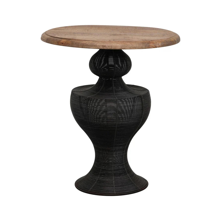 This table can be used in a small eating area, as a side table, or in a sitting room. This table is made out of metal and features a wooden top and a bold black base. The perfect solution to small dining areas or kitchen nooks.