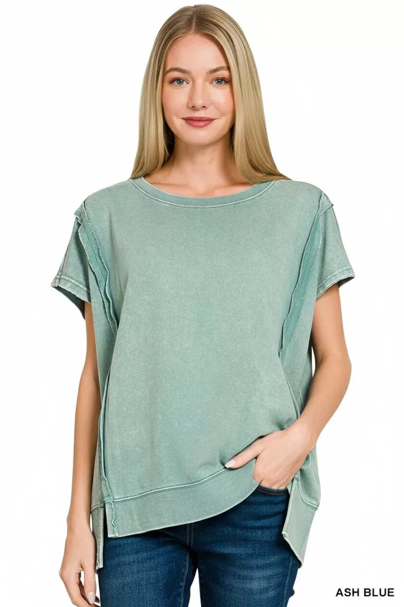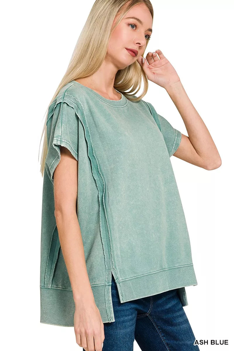This French terry acid-washed hi-low top combines edgy style with comfort. The acid wash gives it a unique and trendy look. The French terry fabric ensures a soft and cozy feel against the skin. The hi-low hemline adds a modern twist to the classic top design. Elevate your casual look with this fashionable and versatile piece.