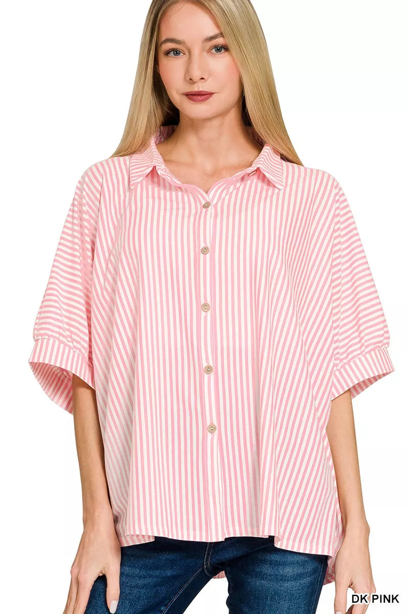 The Oversized Stripe Button Down Shirt is a chic and trendy wardrobe staple. Featuring a classic stripe pattern, this shirt offers a timeless and versatile look. The oversized fit adds a modern twist, providing both comfort and style. With its button-down design, this shirt can be easily dressed up or down for various occasions. Made from high-quality materials, this shirt ensures durability and a flattering drape.